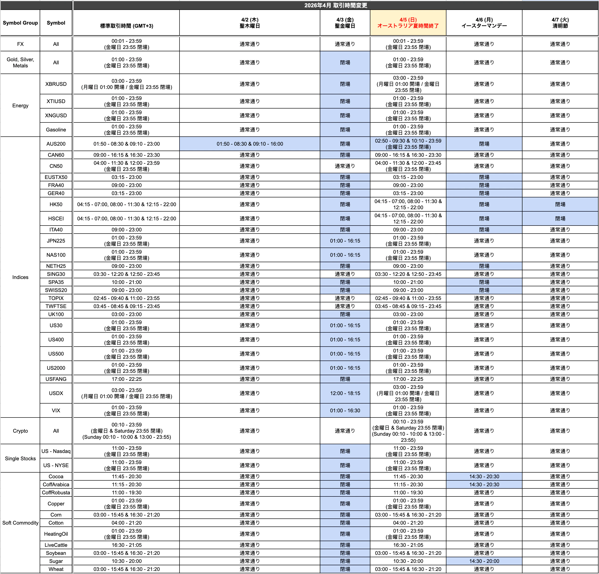 Titan FX Team27th March 20264月5日(日)より、オーストラリア夏時間終了、並びに4月のアメリカ、日本、アジア圏の祝日に伴い、一部商品の取引時間が変更となります。詳しい変更内容は以下の表をご確認のうえ、取引の計画にお役立てください。画像をクリックすると拡大できます。上記以外の取引時間は通常通り。ほぼ満足