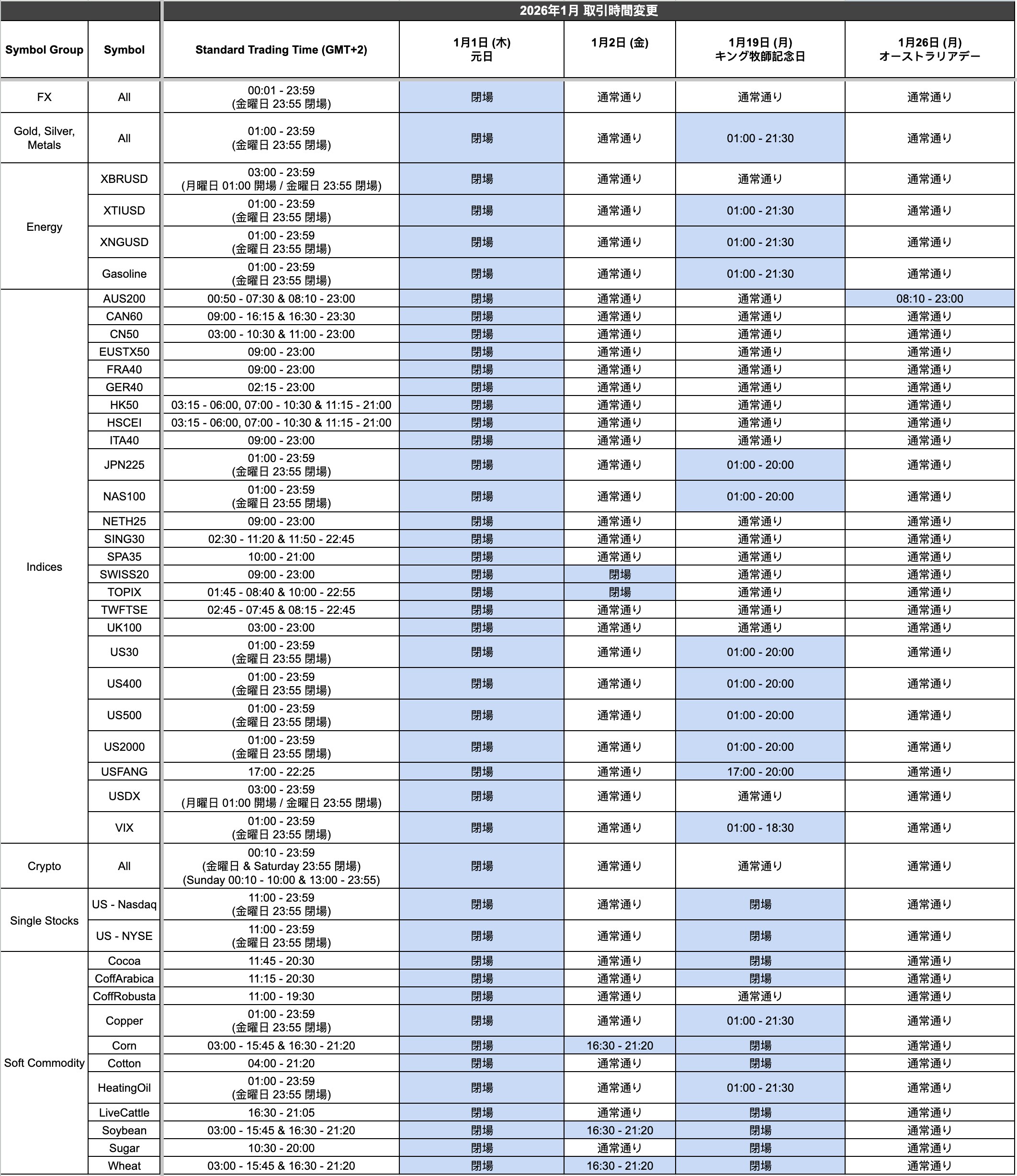 Titan FX Team 14th January 2026 1月の祝日に伴い、一部商品の取引時間が変更となります。詳しい変更内容は以下の表をご確認のうえ、取引の計画にお役立てください。画像をクリックすると拡大できます。上記以外の取引時間は通常通り。 ほぼ満足