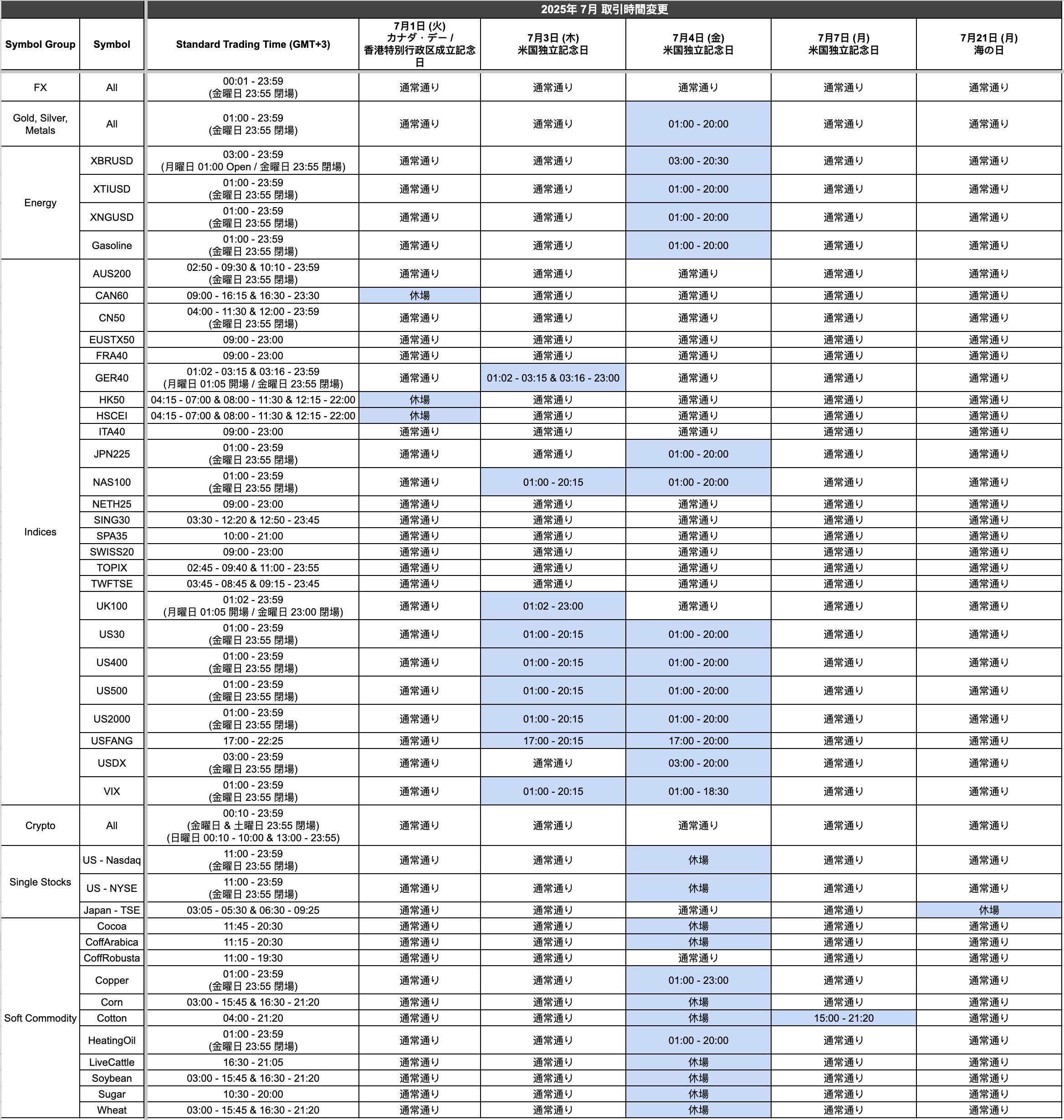 Titan FX Team30th June 20257月1日 (火) カナダ・デー、香港特別行政区成立記念日、3日(木) から 7日(月)の米国独立記念日、21日(月)の海の日に伴い、7月の一部取引時間が変更となります。詳しい変更内容は以下の表をご確認のうえ、取引の計画にお役立てください。表の全体を見るにはスクロールしてください。上記以外の取引時間は通常通り。 表示時間はサーバー時間 (GMT+3)。ほぼ満足