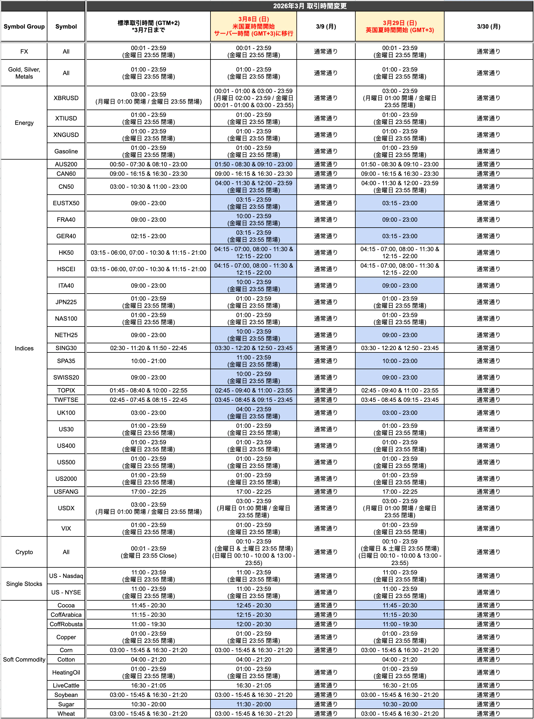 Titan FX Team04th March 2026夏時間(DST)の変更に伴う取引時間の変更について3月8日より、米国の夏時間(DST)移行に伴い、当社のMT4/MT5取引サーバーのタイムゾーンがGMT+2からGMT+3に変更されます。これに伴い、一部の商品の取引時間も変更となります。詳しい変更内容は以下の表をご確認のうえ、取引の計画にお役立てください。画像をクリックすると拡大できます。上記以外の取引時間は通常通り。ほぼ満足