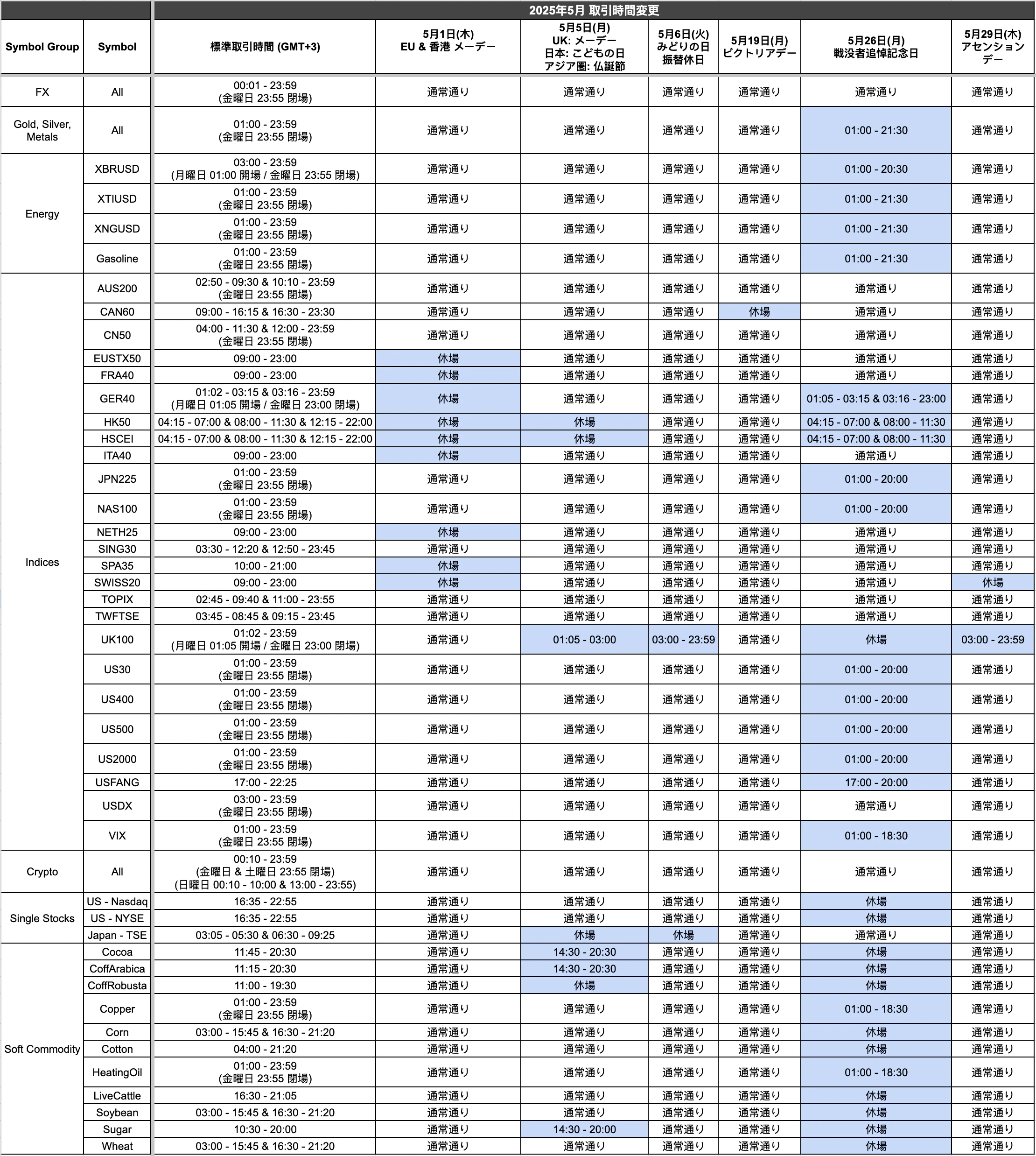 Titan FX Team28th May 20255月のアメリカ、日本、アジア圏の祝日に伴い、一部商品の取引時間が変更となります。詳しい変更内容は以下の表をご確認のうえ、取引の計画にお役立てください。画像をクリックすると拡大します。上記以外の取引時間は通常通り。 表示時間はサーバー時間 (GMT+3)。ほぼ満足
