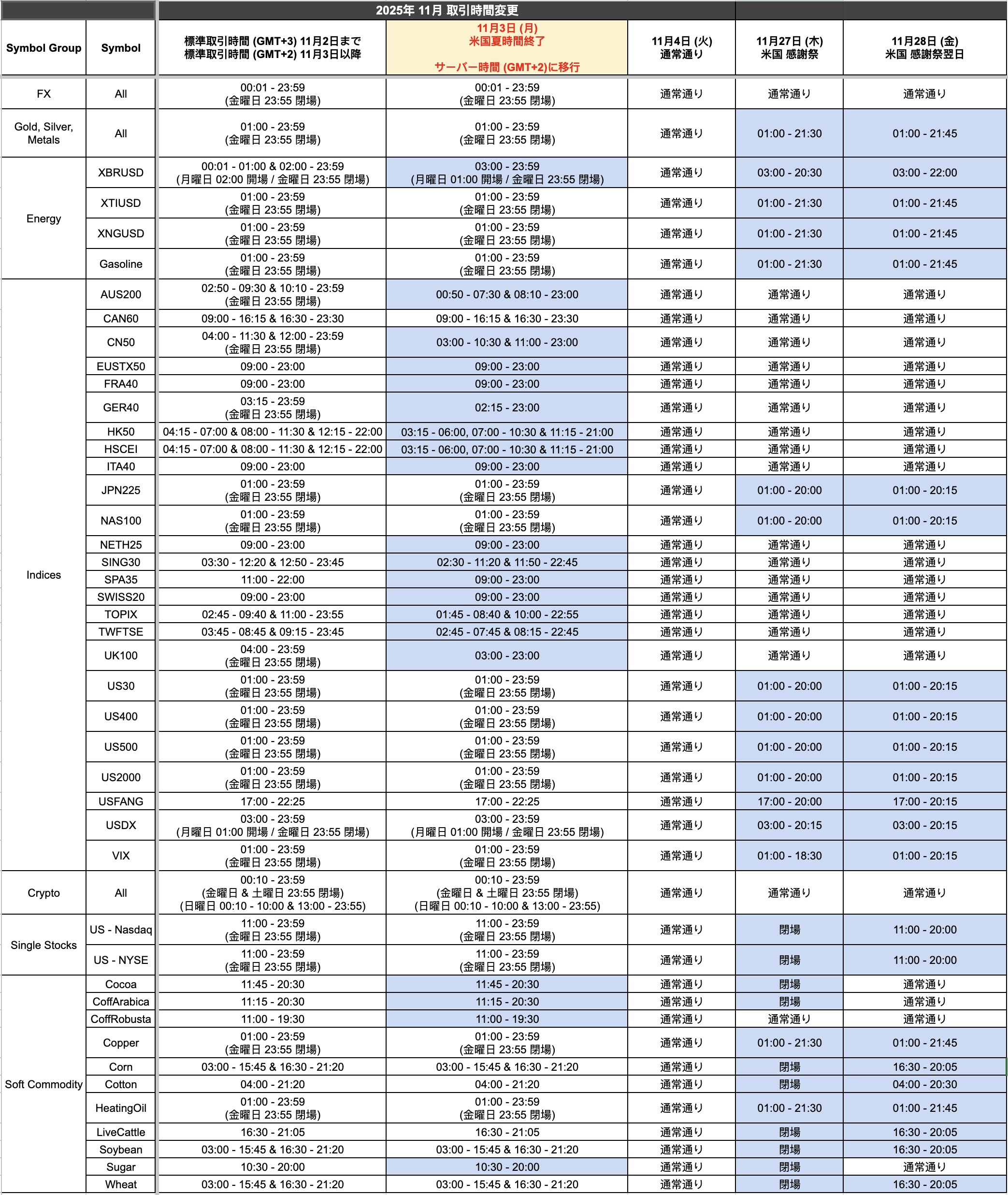 Titan FX Team28th November 202511月の祝日に伴い、一部商品の取引時間が変更となります。 また、米国夏時間終了に伴い、MT4/MT5サーバー時間がGMT+3からGMT+2へ移行します。詳しい変更内容は以下の表をご確認のうえ、取引の計画にお役立てください。画像をクリックすると拡大できます。上記以外の取引時間は通常通り。ほぼ満足