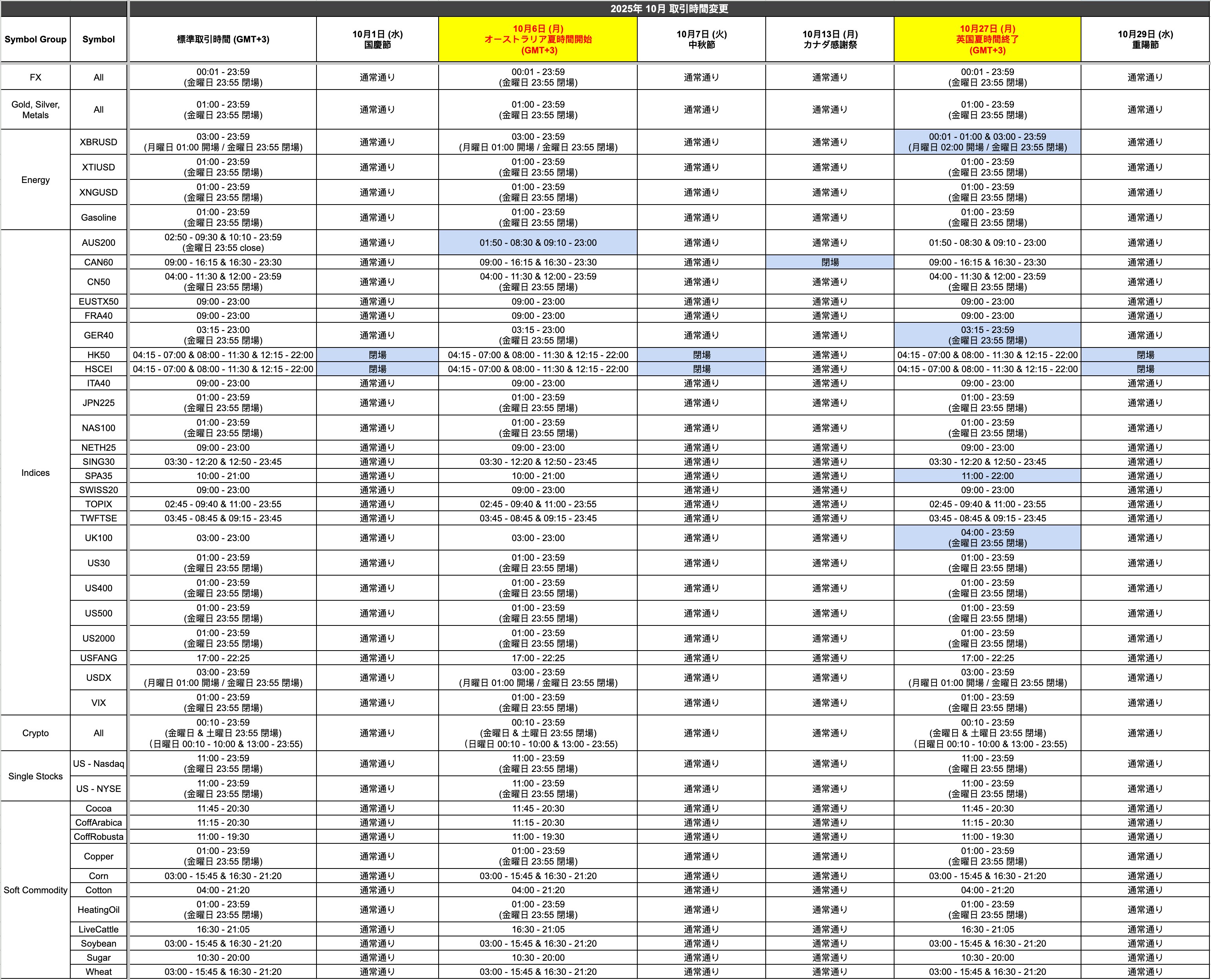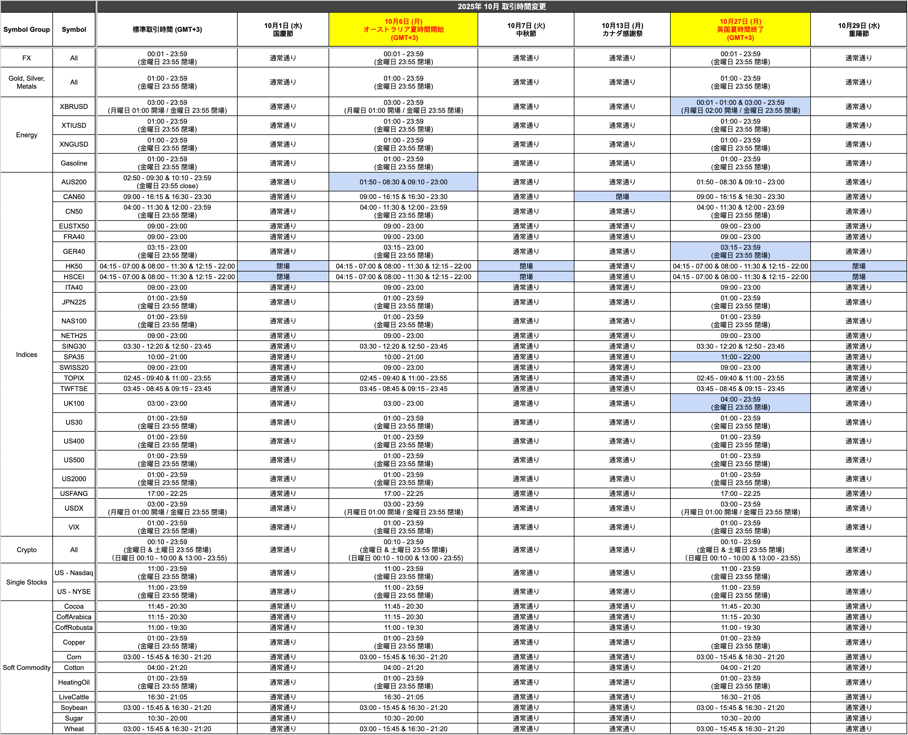 10月の祝日、ならびにオーストラリアでの夏時間開始および英国での夏時間終了に伴い、10月の一部取引時間が変更となります。