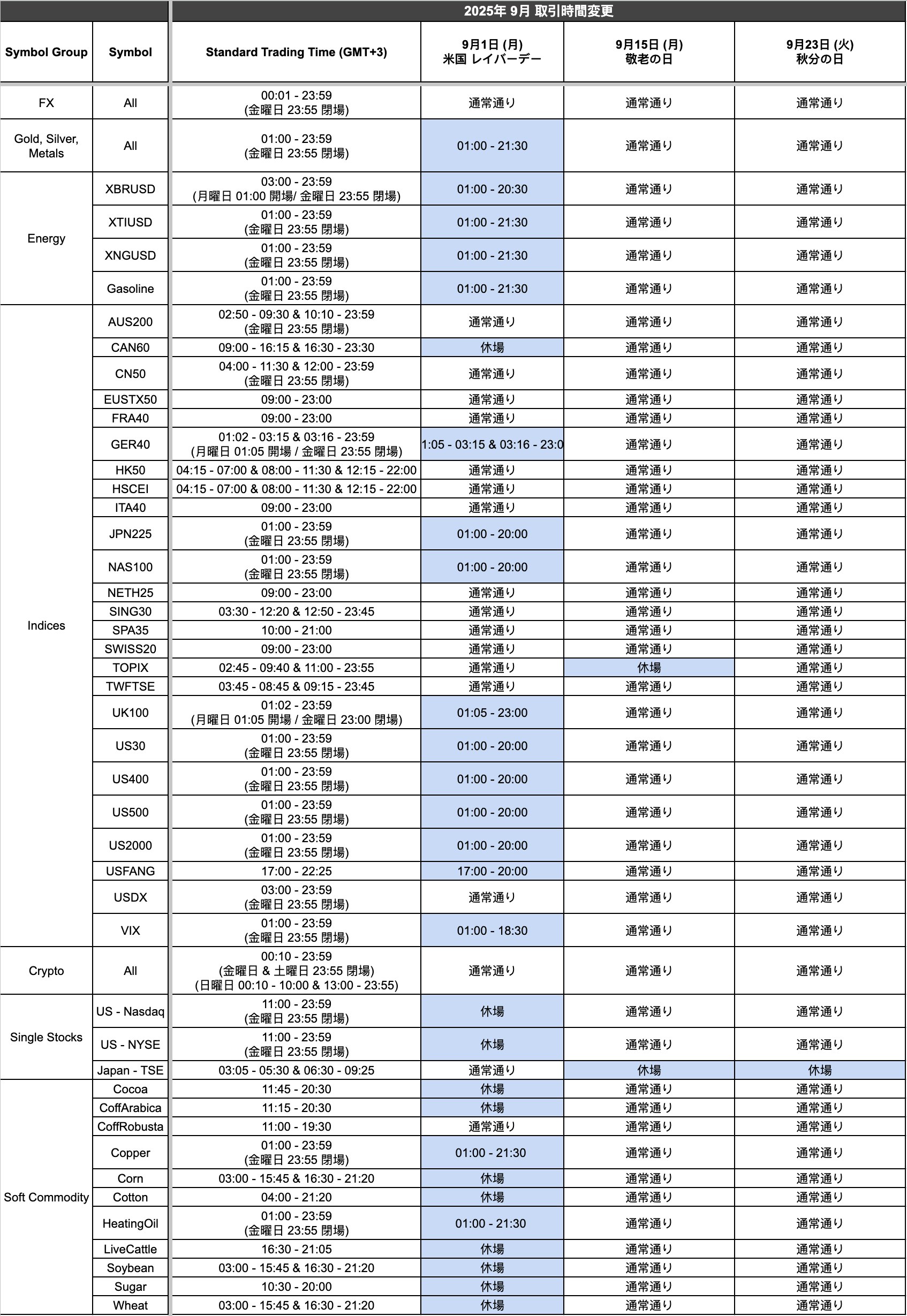 Titan FX Team28th August 2025下記の祝日に伴い、9月の一部取引時間が変更となります。9月1日 (月) 米国 レイバーデー9月15日 (月) 敬老の日9月23日 (火) 秋分の日詳しい変更内容は以下の表をご確認のうえ、取引の計画にお役立てください。表の全体を見るにはスクロールしてください。上記以外の取引時間は通常通り。 表示時間はサーバー時間 (GMT+3)。ほぼ満足