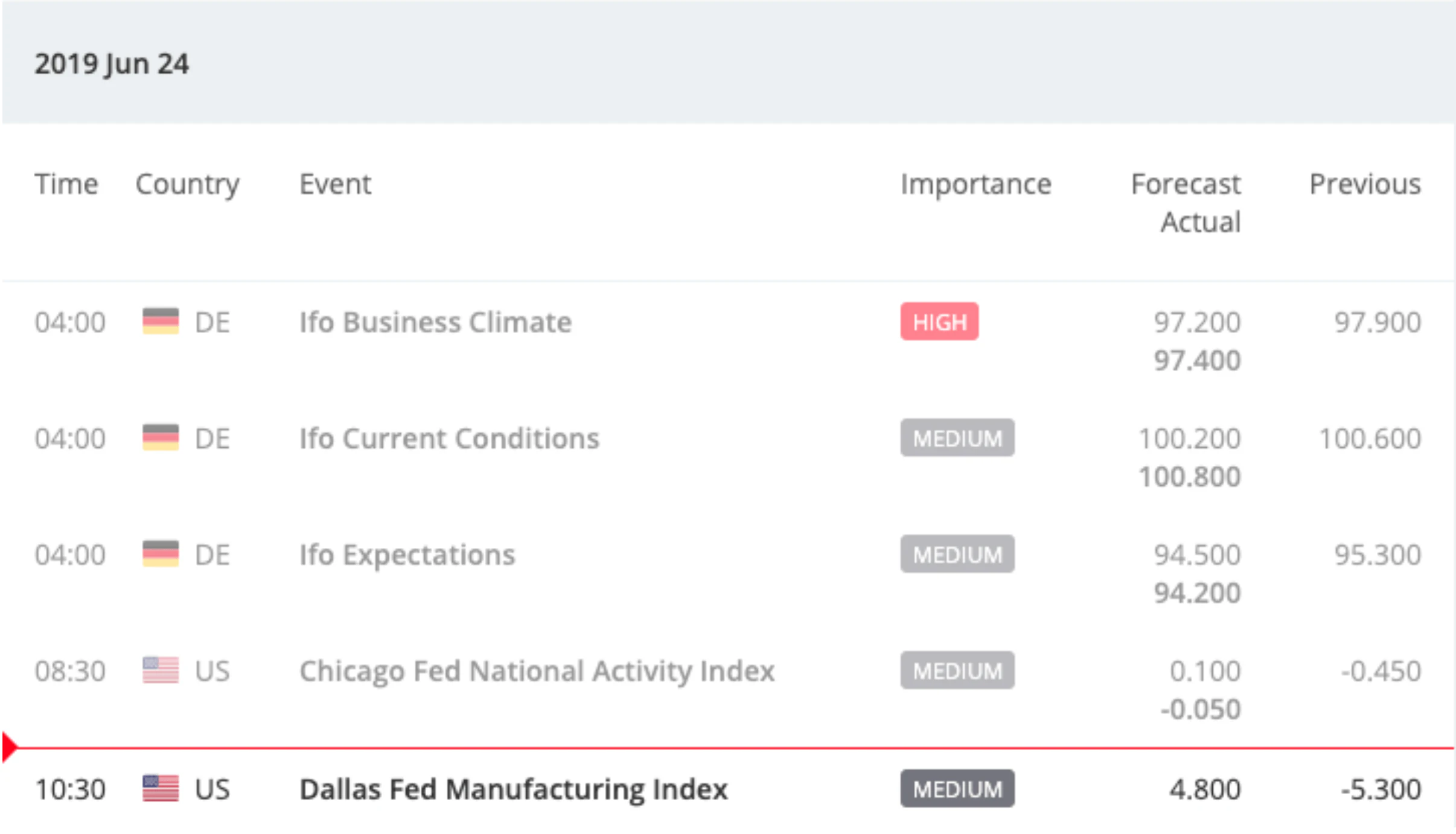 Here you’ll find current and upcoming economic events listed in chronological order with a red line marking the current time. We’ll automatically detect your local timezone, but you can always switch this at the top if needed!