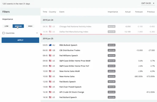 To the left, you’ll find the filter, where you can easily tailor your calendar to display events of interest by either country or importance.