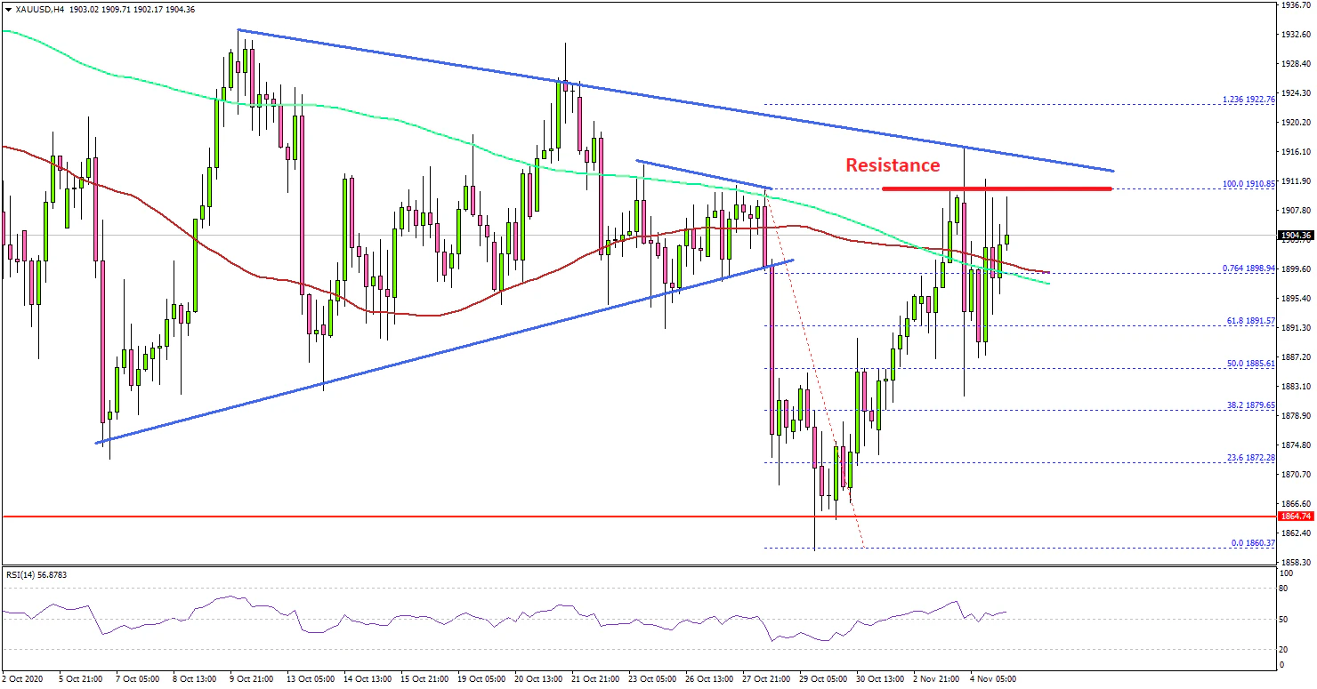 - Gold price is recovering higher, but it is facing a strong resistance near $1,910.