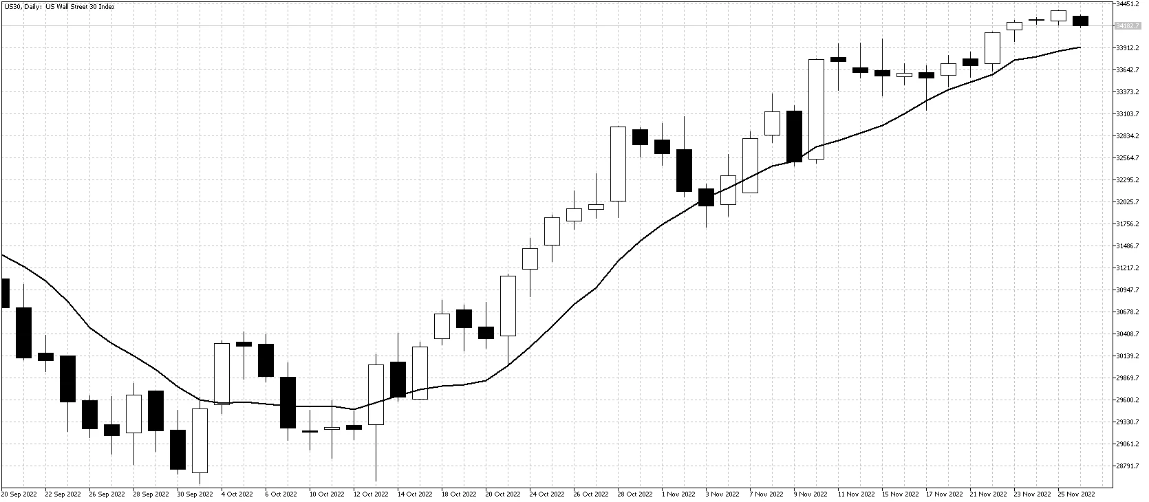The uptrend continued in slow conditions as the market celebrated Thanksgiving. The Dow Jones rose above the August high as investors gained confidence from lower long-term US interest rates.