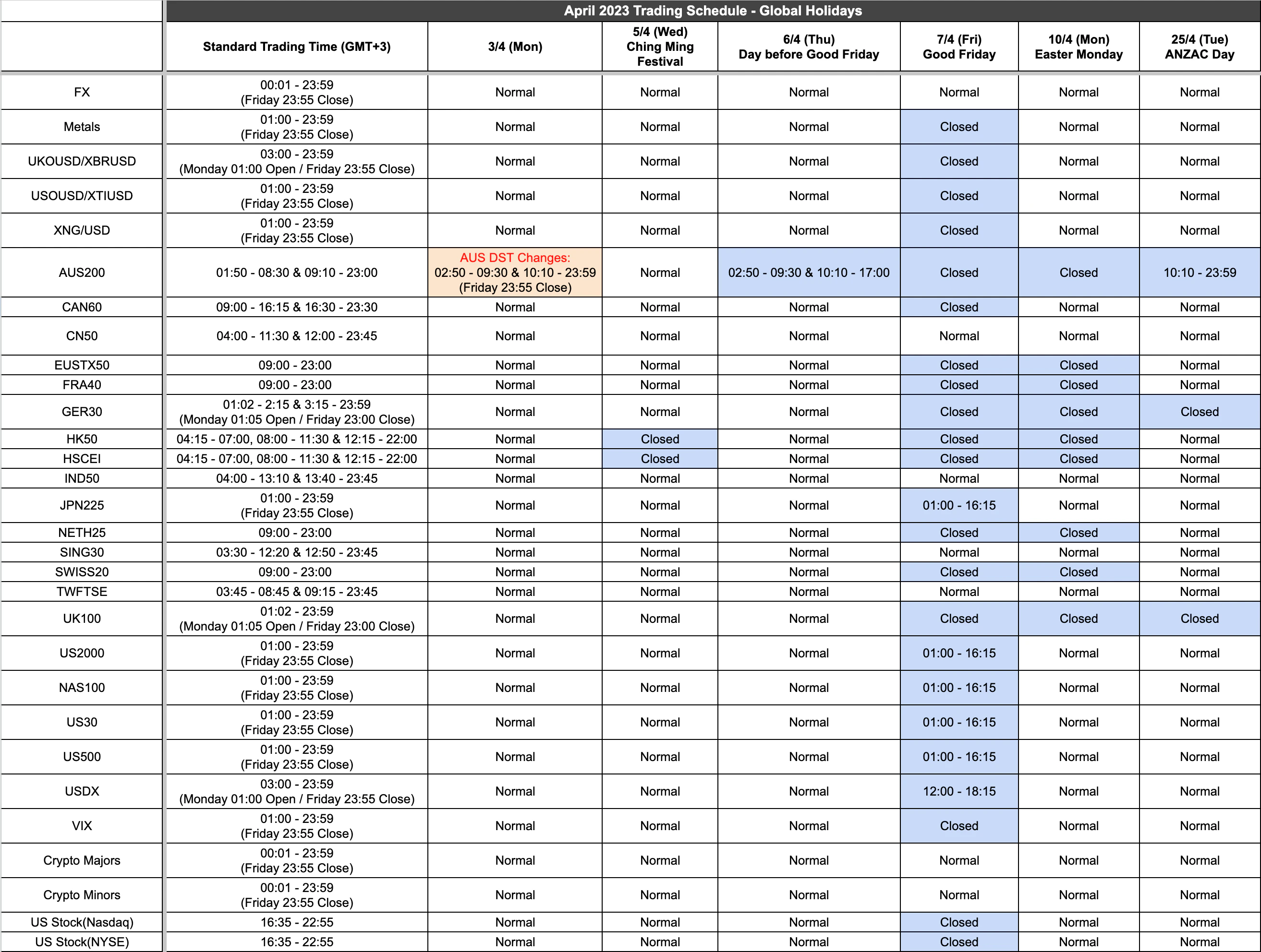 Due to these holidays the market trading hours for a number of tradable products will be temporarily altered. AUS200 trading hours will also be changing in order to accommodate the DST changes in Australia.
