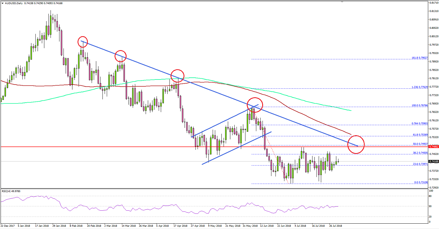 Looking at the daily chart, the pair recovered above the 23.6% Fibonacci retracement level of the last decline from the 0.7670 swing high to 0.7310 swing low. However, the previous support area near 0.7490-0.7500 acted as a resistance.Additionally, the 50% Fibonacci retracement level of the last decline from the 0.7670 swing high to 0.7310 swing low also acted as a resistance. More importantly, there is a crucial bearish trend line in place with resistance at 0.7500 on the same chart.Therefore, it won’t be easy for the Aussie dollar to break the 0.7490 and 0.7500 resistance levels. Above 0.7500, the 100-day simple moving average (red) is positioned at 0.7540. As long as AUD/USD is below 0.7500 and the 100-day SMA, it may perhaps either consolidate or move down towards 0.7200.On the flip side, a close above 0.7500 and the 100-day SMA could push the pair in a positive zone towards the 0.7600 and 0.7700 levels in the medium term.Recently in the US, the Personal Income for June 2018 was released by the Bureau of Economic Analysis, Department of Commerce. The market was looking for a 0.4% rise the personal income compared with the previous month.The actual result was in line with the forecast and similar to the last reading. Looking at the Core Personal Consumption Expenditure in June 2018, there was a rise of 1.9%, less than the forecast of 2%.Overall, AUD/USD is facing an uphill task near 0.7500. However, today’s fed rate decision could ignite swing moves in pairs like EUR/USD, GBP/USD, AUD/USD, USD/JPY and NZD/USD.Economic Releases to Watch Today