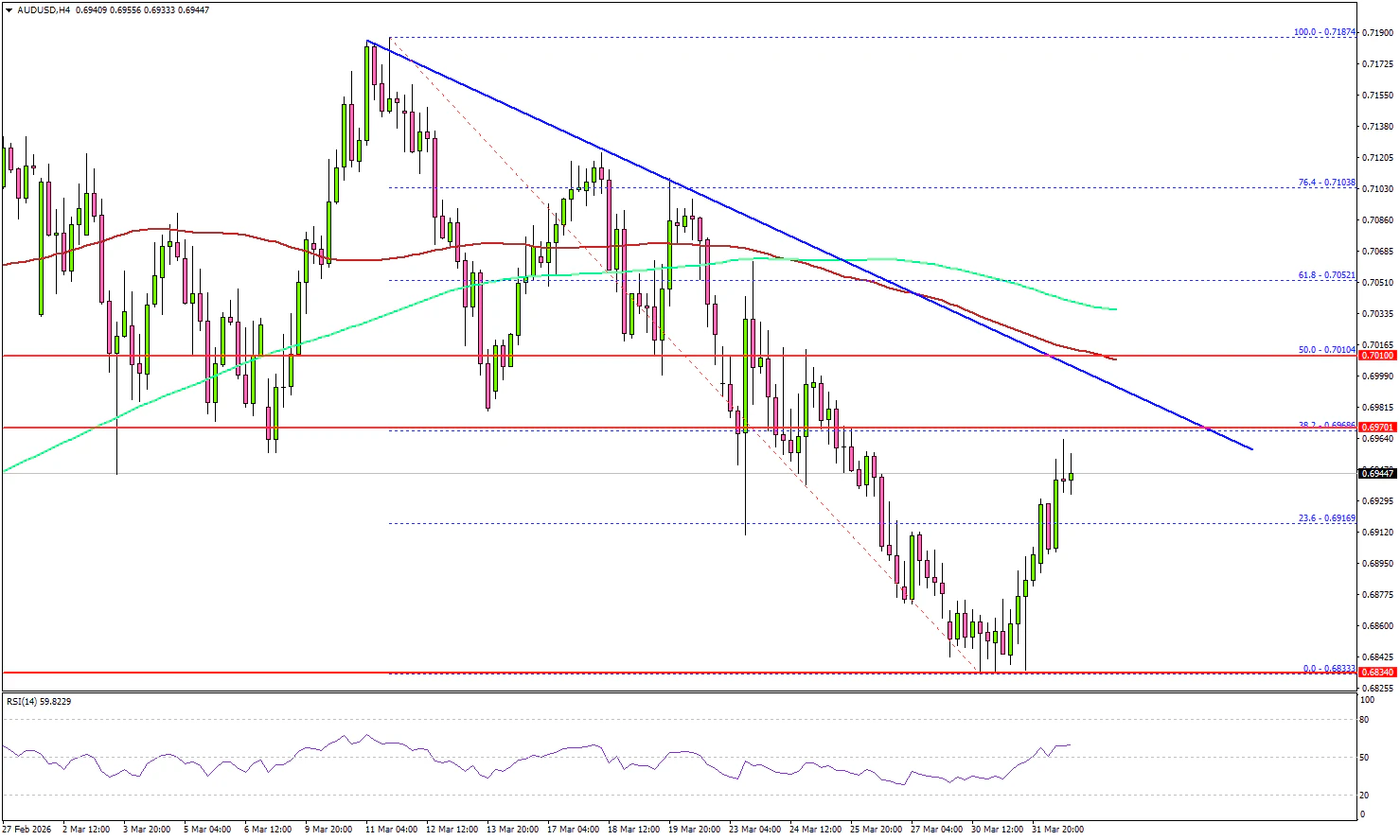 - A major bearish trend line is forming with resistance at 0.6980 on the 4-hour chart.