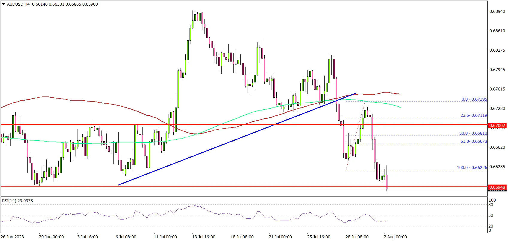 Looking at the 4-hour chart, the pair even traded below a major bullish trend line with support at 0.6740. There was a close below the 0.6650 support, the 100 simple moving average (red, 4 hours), and the 200 simple moving average (green, 4 hours).