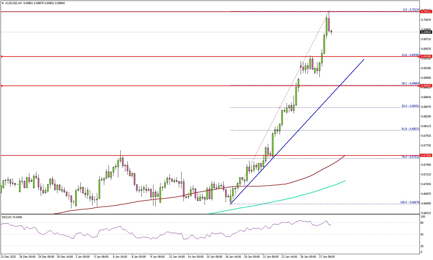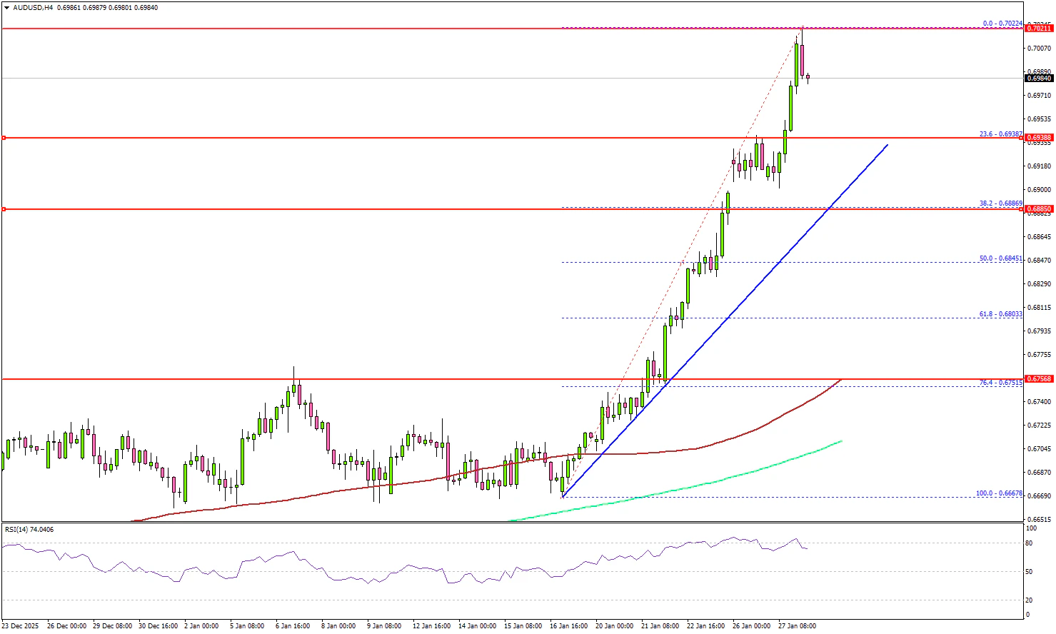 A close above 0.7000 could open the doors for more gains. In the stated case, the bulls could aim for a move toward 0.7120. If there is a pullback, AUD/USD might find bids near 0.6900 or the trend line.