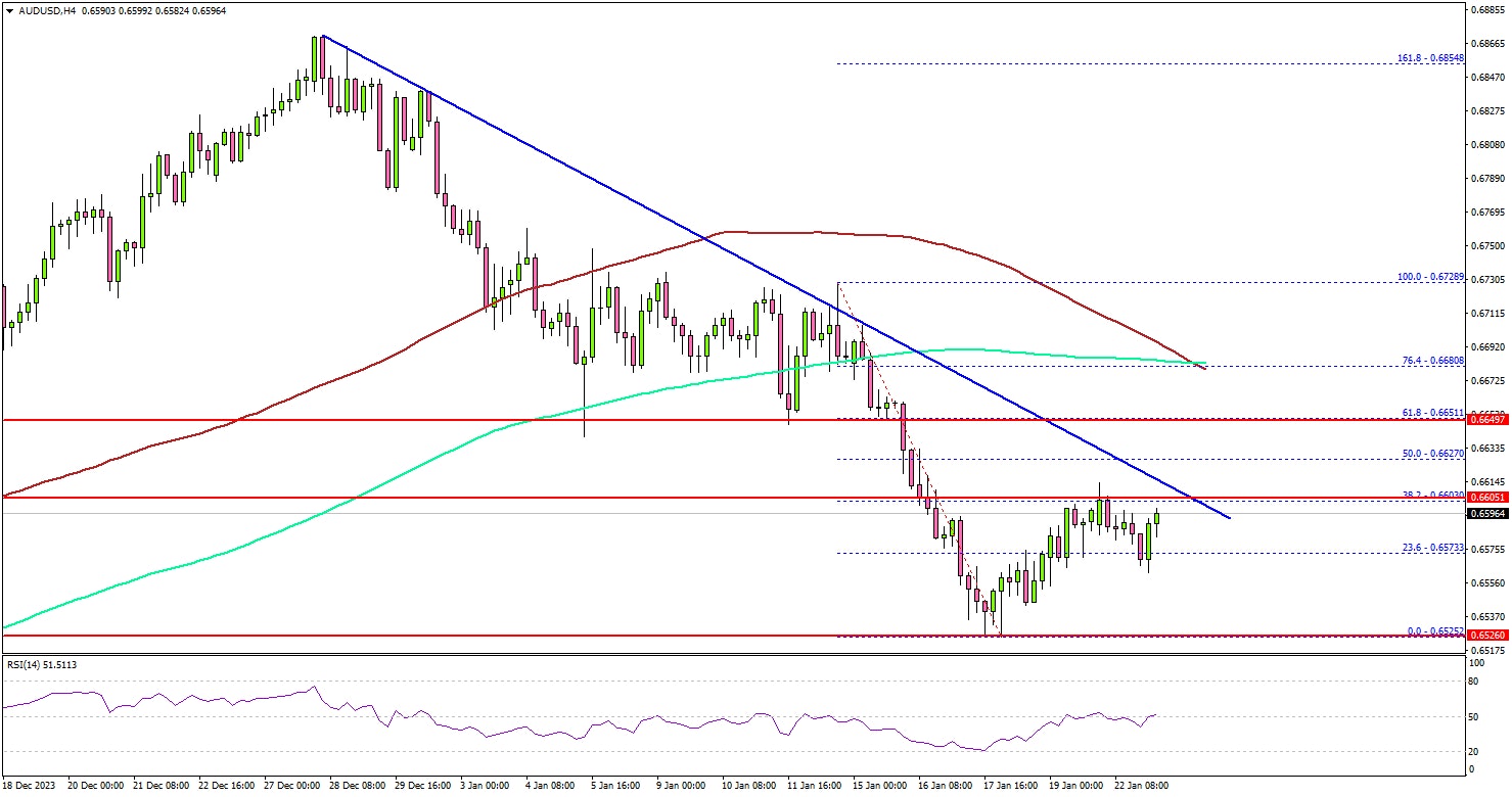 A low was formed near 0.6525 and the pair is now attempting a recovery wave. There was an increase above the 0.6575 resistance. It cleared the 23.6% Fib retracement level of the downward move from the 0.6728 swing high to the 0.6525 low.