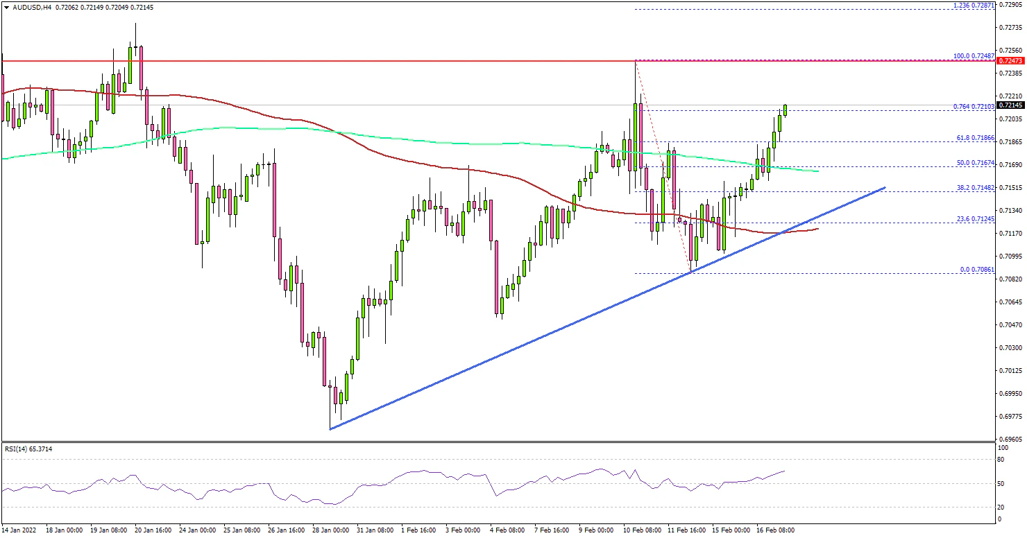 - A key bullish trend line is forming with support near 0.7140 on the 4-hours chart.