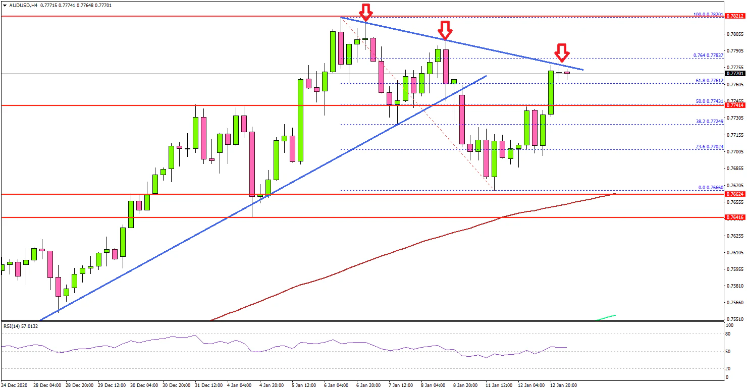 A clear break above 0.7770 and 0.7780 could set the pace for a fresh push above 0.7800. Conversely, the pair could start a fresh downward move towards the 0.7720 and 0.7700 support levels.