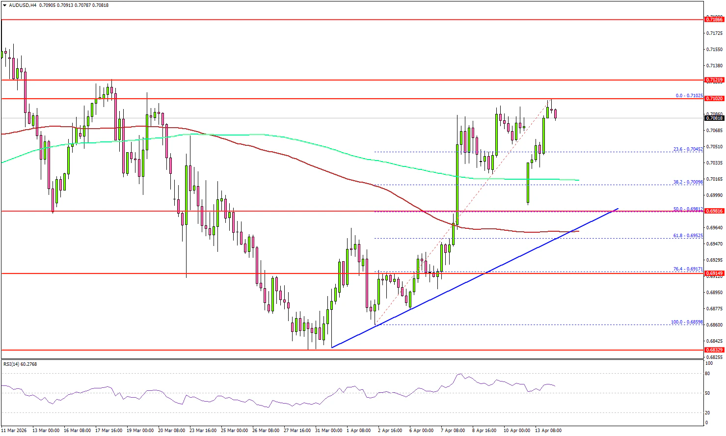 Looking at the 4-hour chart, the pair settled above the 0.7040 level, the 100 simple moving average (red, 4-hour), and the 200 simple moving average (green, 4-hour). A high was formed at 0.7102, and the pair is now consolidating gains.