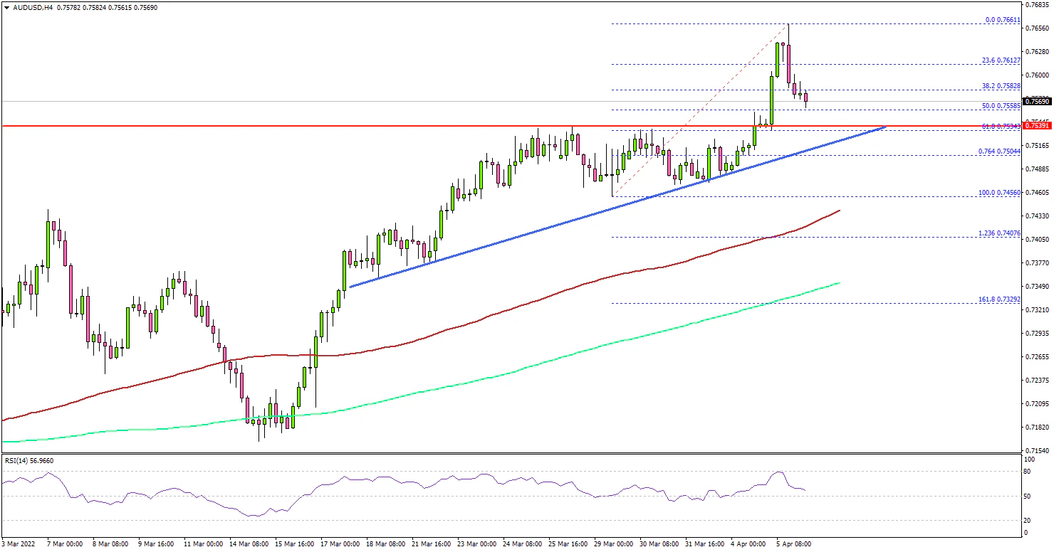 The upward move was such that the pair climbed above 0.7600 and traded to a new multi-week high. On the upside, an immediate resistance is near the 0.7650.
