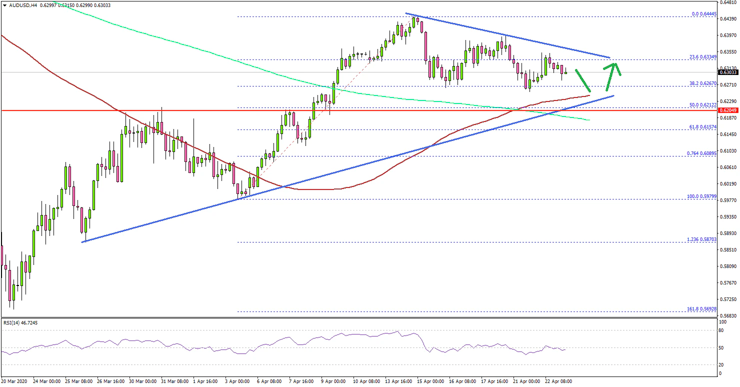 Recently, there was a downside correction below the 0.6350 support level. The pair even tested the 38.2% Fib retracement level of the key upward move from the 0.5979 low to 0.6444 high.
