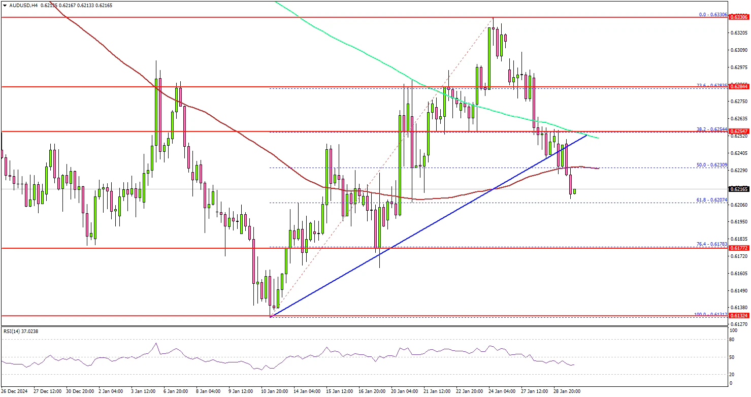 - It traded below a key bullish trend line with support at 0.6240 on the 4-hour chart.