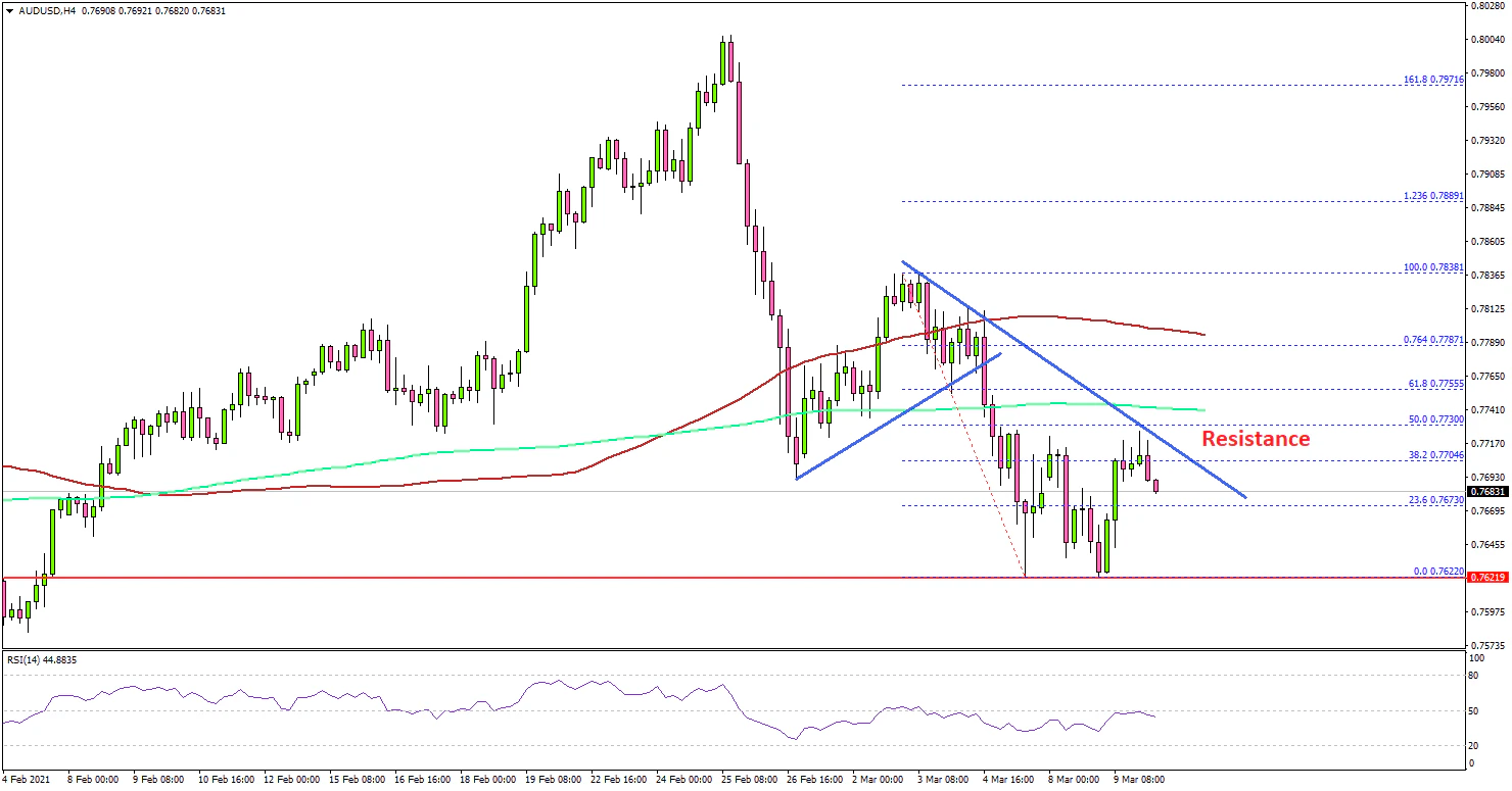 It corrected above the 23.6% Fib retracement level of the downward move from the 0.7838 high to 0.7622 low. The first major resistance is near 0.7730 level. There is also a key bearish trend line forming with resistance near 0.7735 on the same chart.
