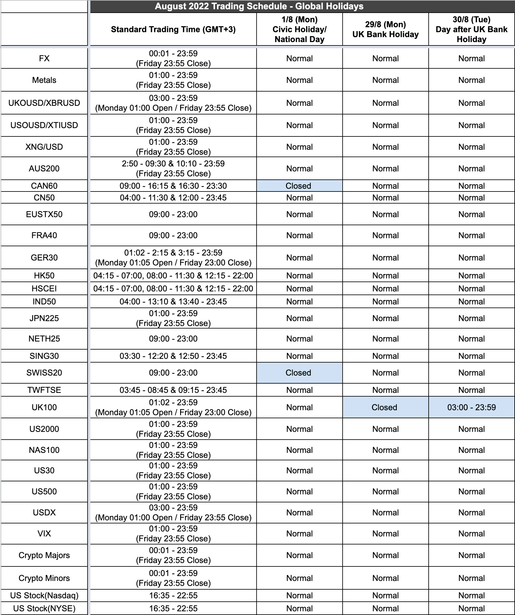 There are a number of global holidays to come in August including Civic Holiday, National Day, and UK Bank Holiday. Due to these holidays the market trading hours for a number of tradable products will be temporarily altered.