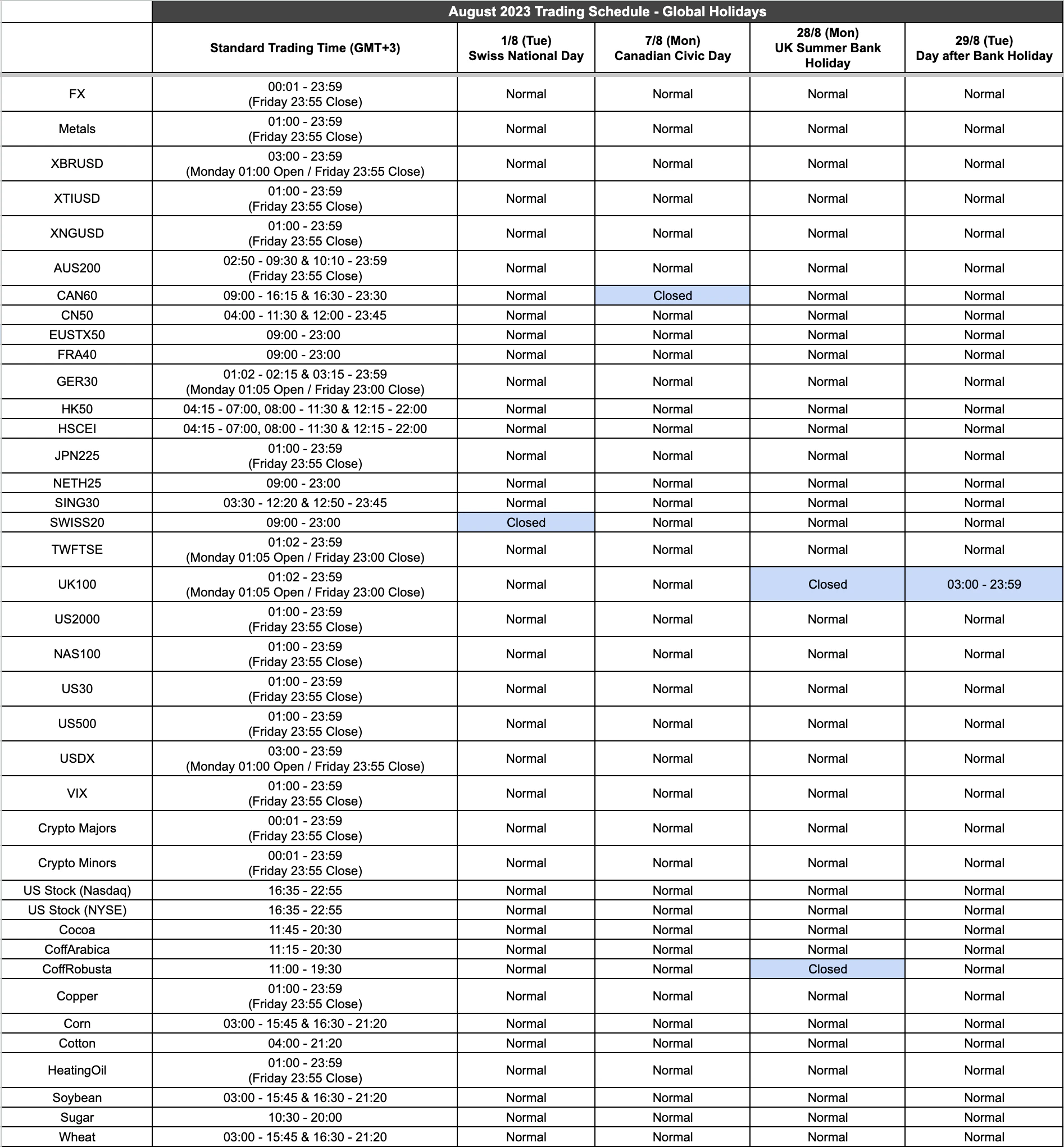 There are a few global holidays to come in the month of August, including Swiss National Day, Canadian Civic Day and UK Summer Bank Holiday. Due to these holidays the trading hours for a number of products will be temporarily altered.