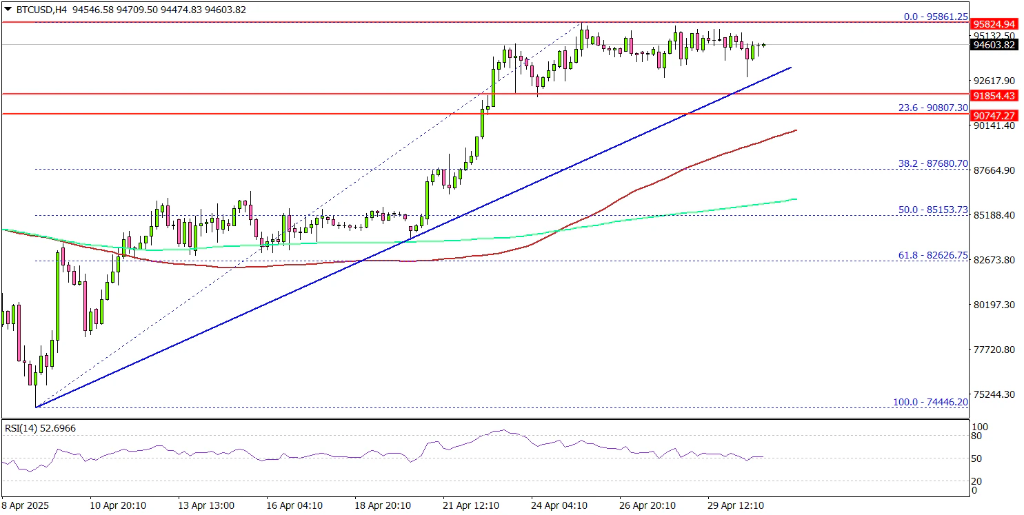 Immediate support is near the $94,200 level. There is also a connecting bullish trend line forming with support at $92,400 on the same chart. The next key support sits at $90,800 or the 23.6% Fib retracement level of the upward move from the $74,446 swing low to the $95,861 high.