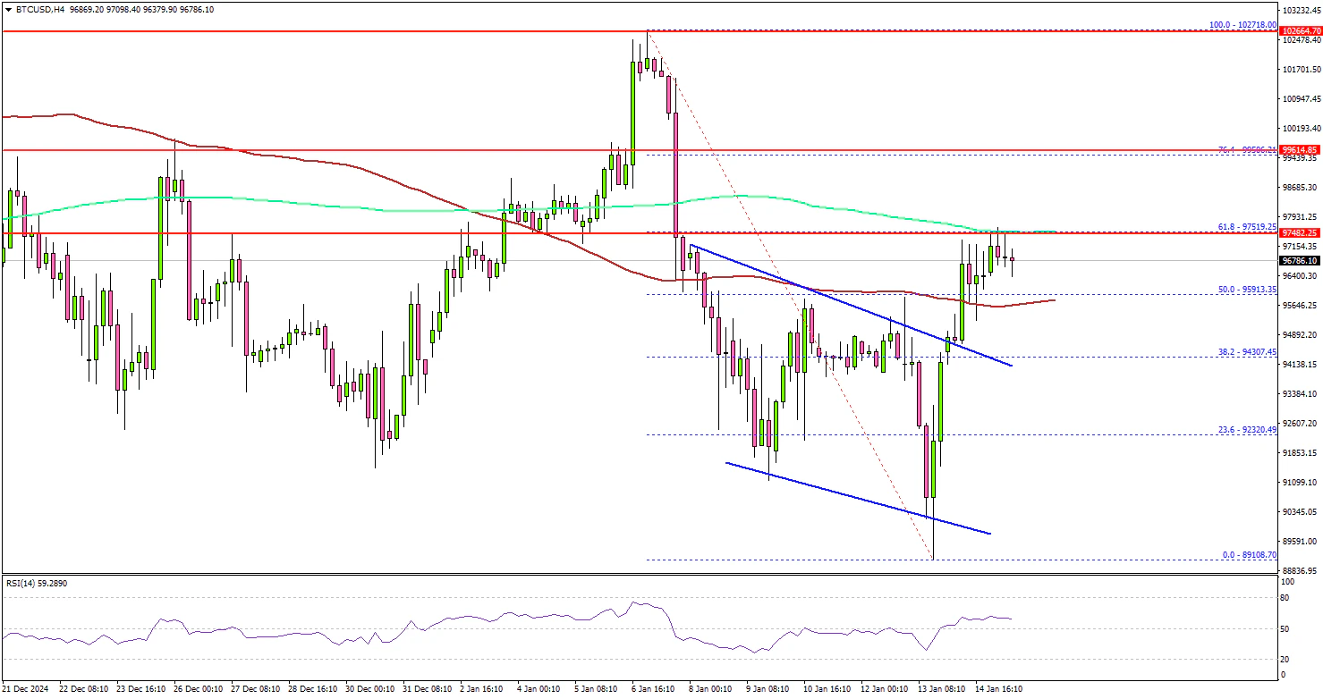 The 61.8% Fib retracement level of the downward move from the $102,718 swing high to the $89,108 low acted as a resistance. On the upside, the price could face resistance near the $97,500 level. The next key resistance is $100,000.