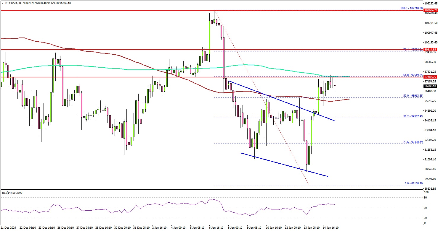 BTC even cleared the 100 simple moving average (red, 4-hour) and tested the 200 simple moving average (green, 4-hour). It faced hurdles near the $97,500 level.