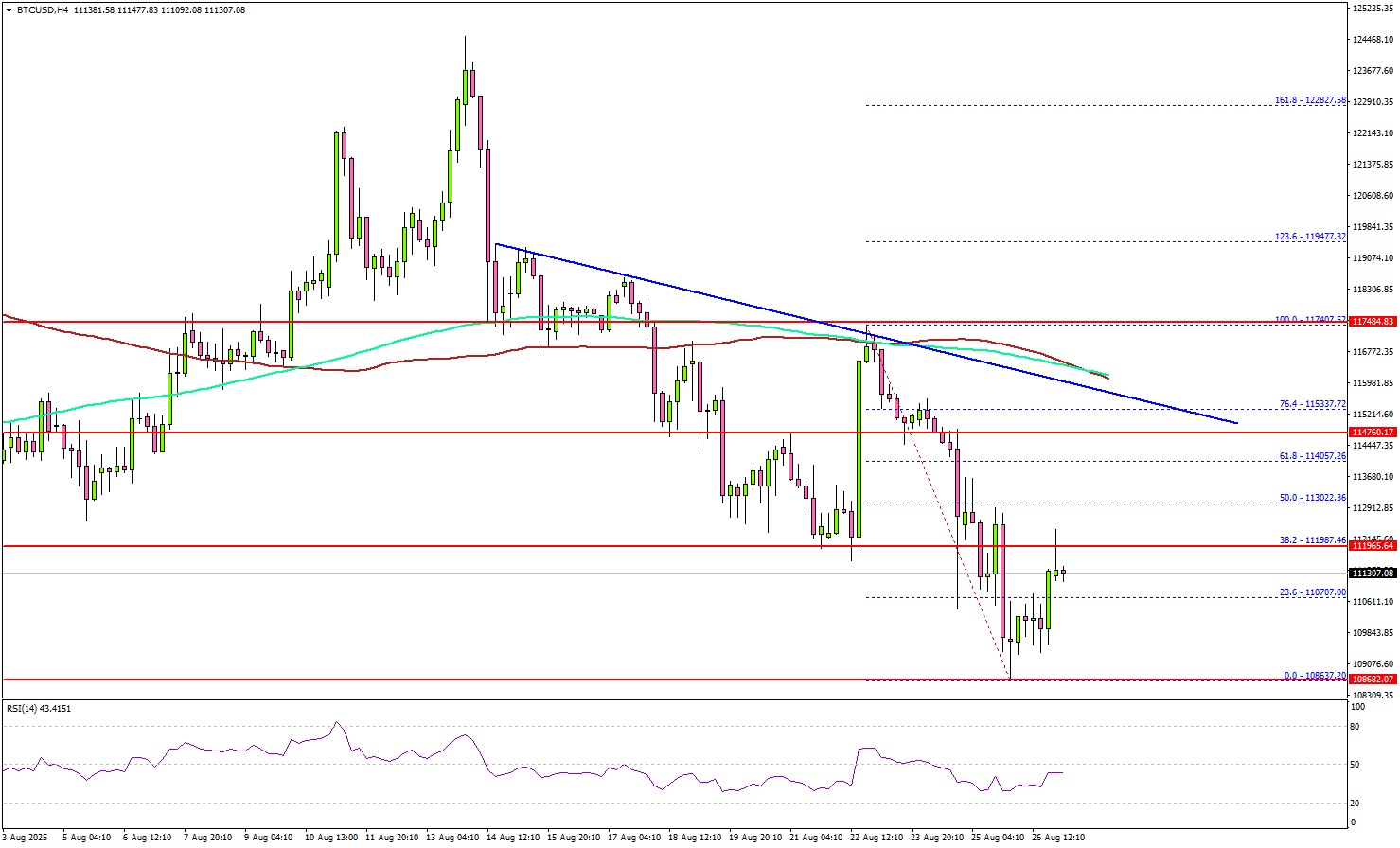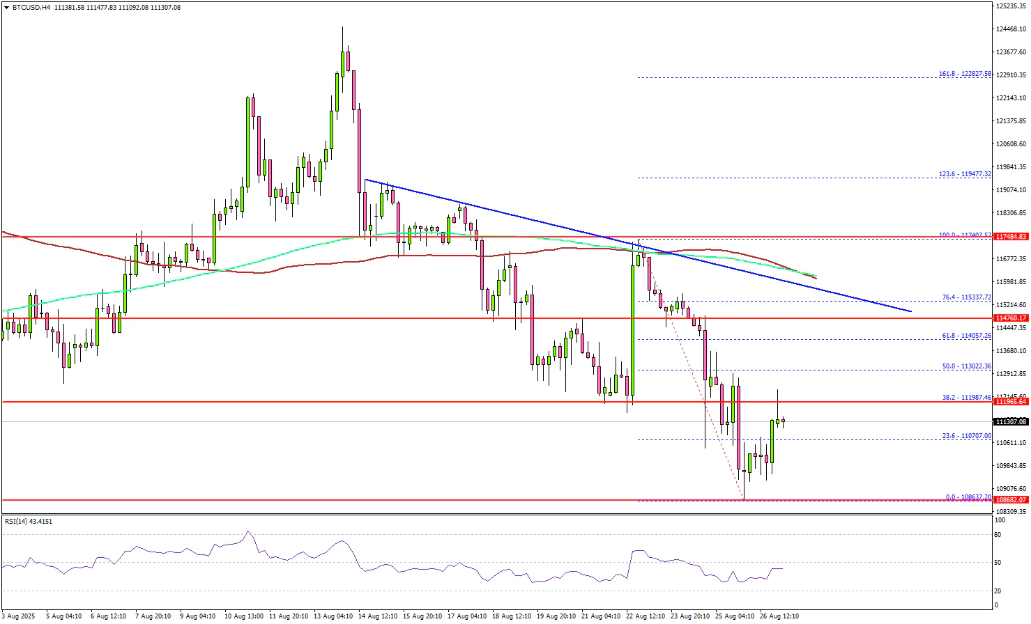 Looking at the 4-hour chart, the price tested the $108,650 zone and is currently consolidating losses. If there is a recovery wave, the price could face resistance near $112,000 and the 38.2% Fib retracement level of the downward move from the $117,407 swing high to the $108,637 low.