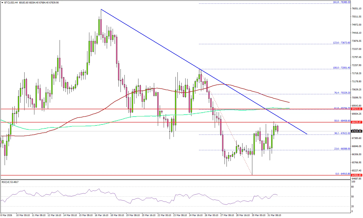 Looking at the 4-hour chart, the price surpassed the 23.6% Fib retracement level of the downward move from the $72,001 swing high to the $64,915 low. However, the bears seem to be active near the $68,500 resistance.
