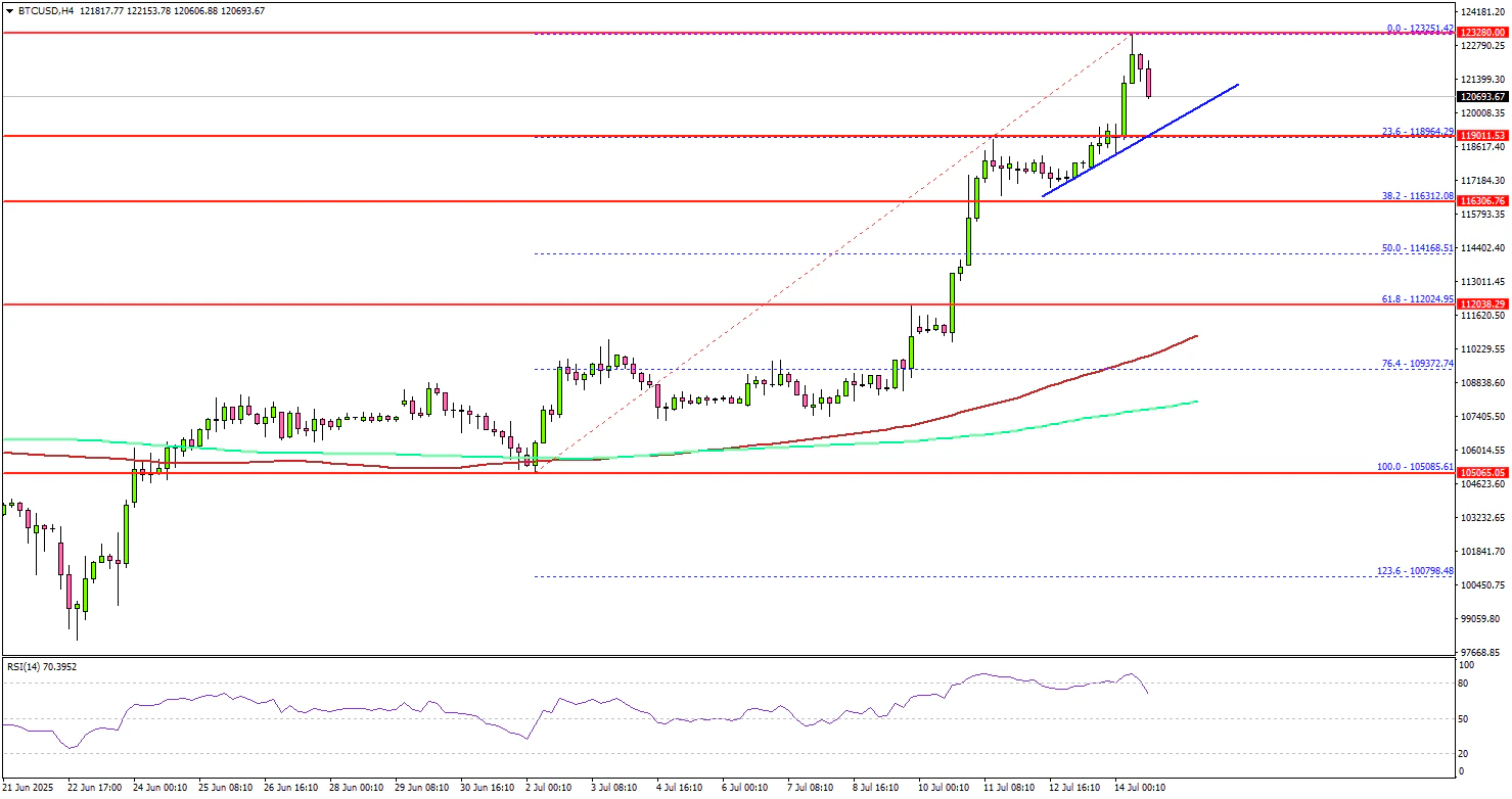 A new all-time high was formed near $123,200 and the price is now consolidating gains. If there is a pullback, Bitcoin might find support near the $119,500 level.
