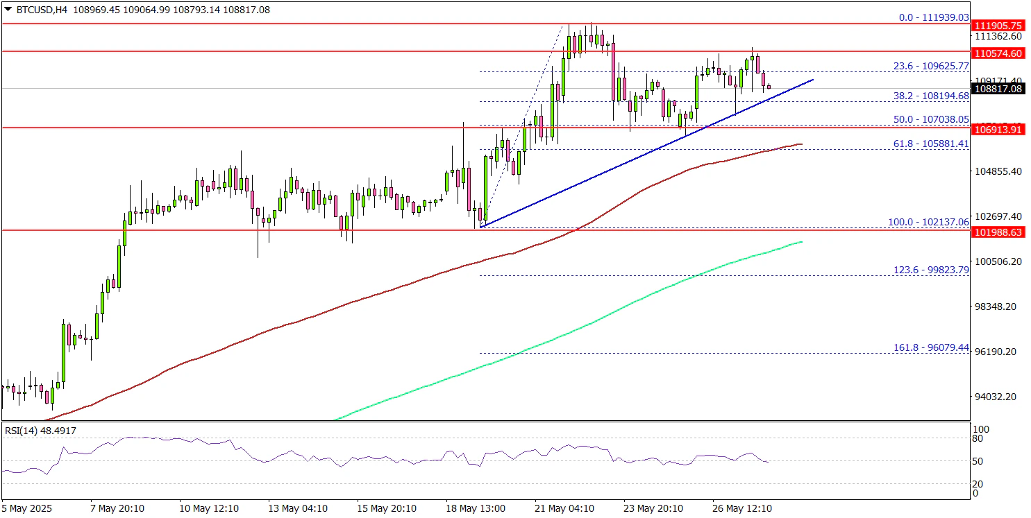 - BTC/USD is trading above a connecting bullish trend line with support at $108,000 on the 4-hour chart.