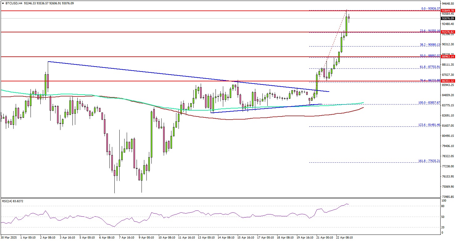 The next key resistance is $94,500. The main resistance could be $95,000. A successful close above $95,000 might start another steady increase. In the stated case, the price may perhaps rise toward the $98,000 level. Any more gains might call for a test of $100,000.