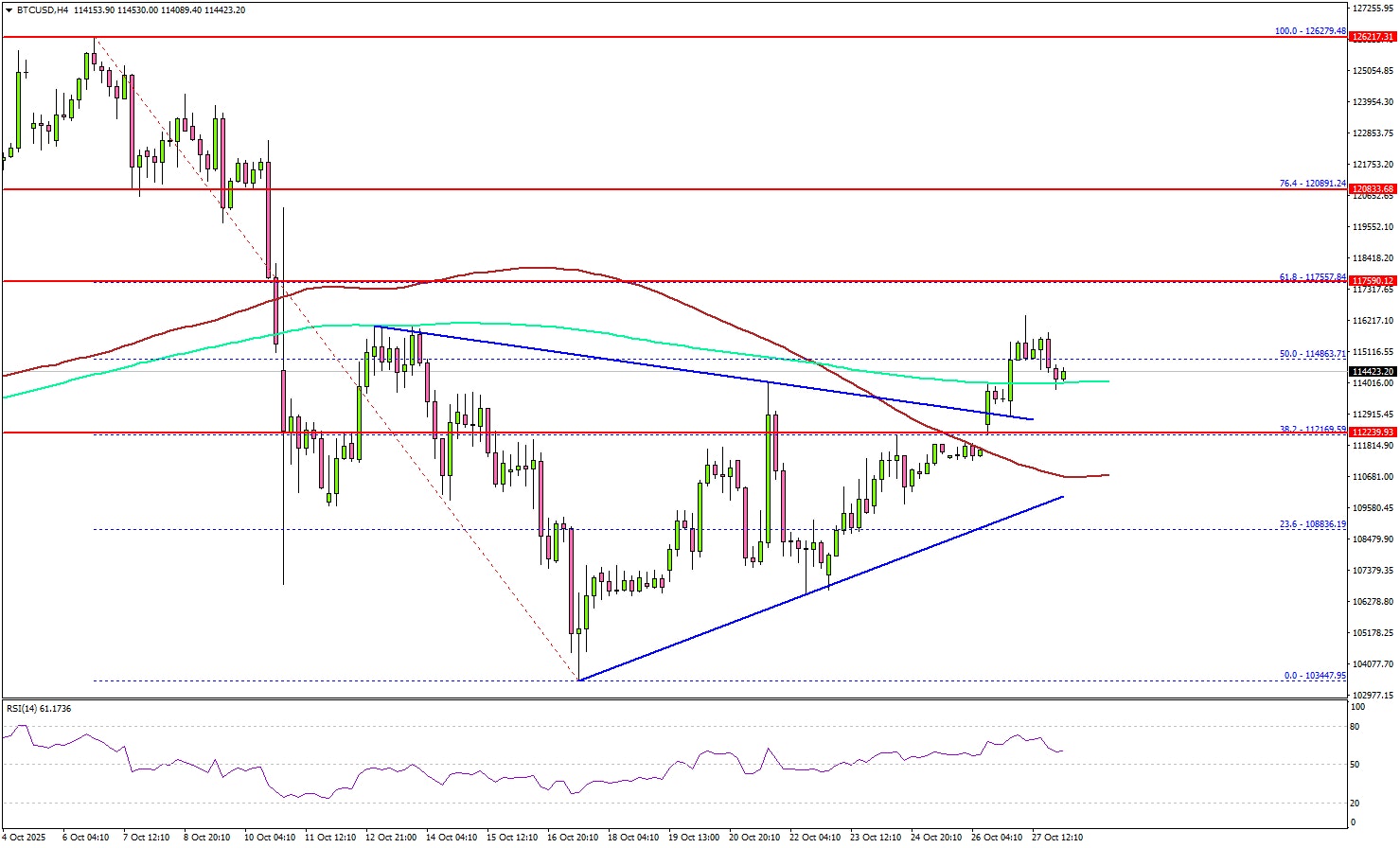 The main hurdle is now forming near $117,550 and the 61.8% Fib retracement level of the downward move from the $126,279 swing high to the $103,447 low. A successful close above $117,550 might start another steady increase. In the stated case, the price may perhaps rise toward the $118,800 level. Any more gains might call for a test of $120,000.