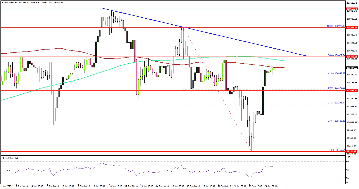 Looking at the 4-hour chart, the price settled above the $104,000 level and tested the 100 simple moving average (red, 4-hour). The price surpassed the 61.8% Fib retracement level of the downward move from the $108,978 swing high to the $98,169 low.