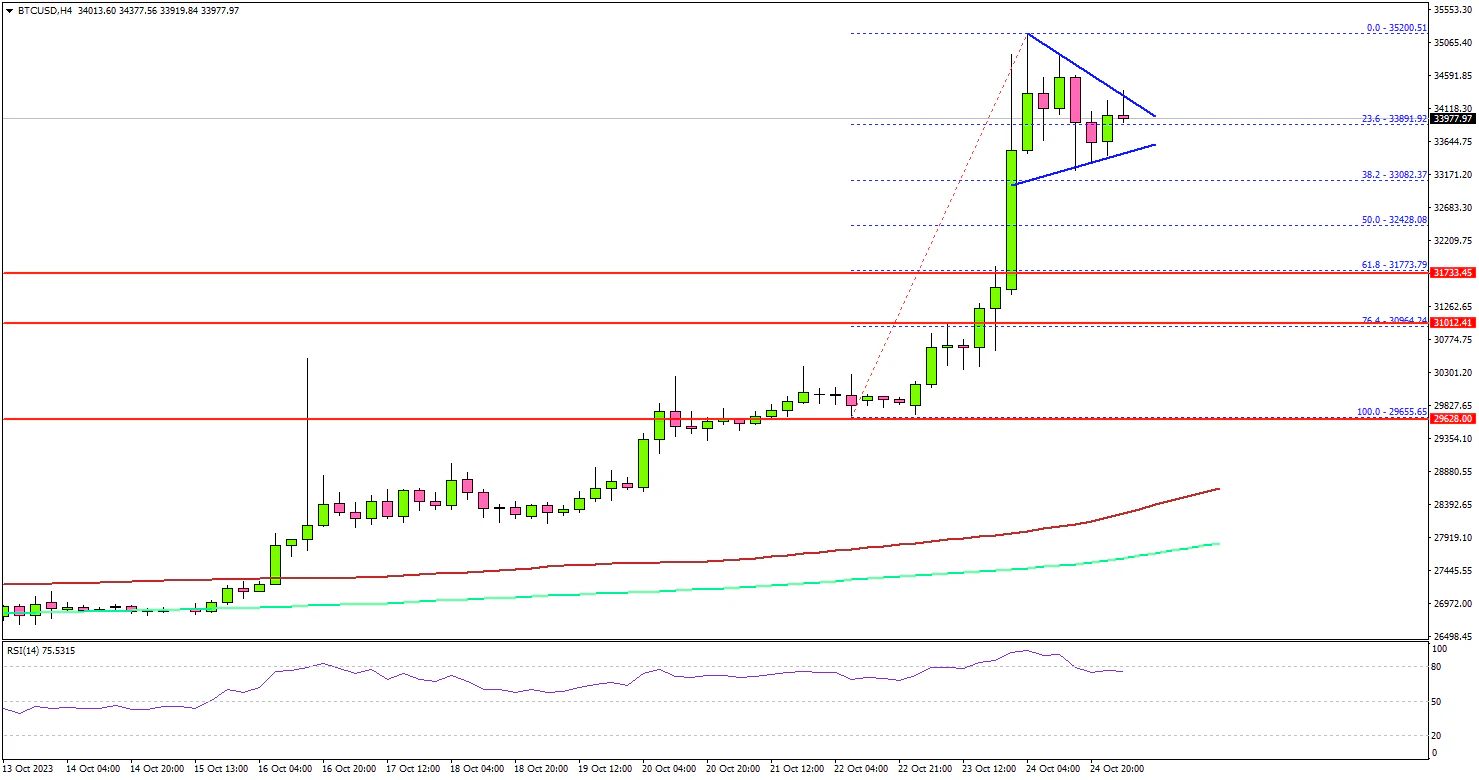 Looking at the 4-hour chart, the price rallied above the $32,000 and $33,200 resistance levels. The price even surged toward the $35,000 level before the bears appeared. A high was formed near $35,200 and the price is now consolidating gains.