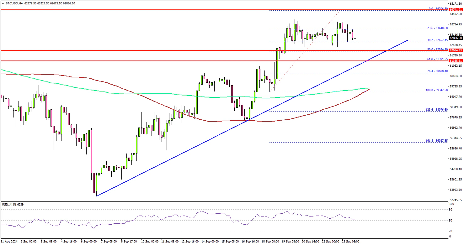 The price is now consolidating gains below $64,200. Immediate support is near the $62,500 level. The next key support sits at $62,000. There is also a connecting bullish trend line with support at $61,500 on the same chart.