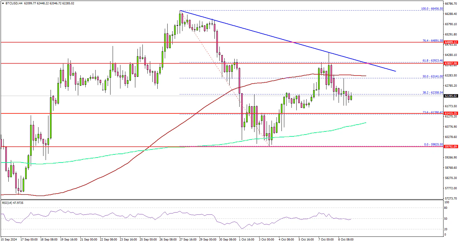The price corrected gains and declined below the $63,500 level. Immediate support is near the $62,200 level. The next key support sits at $61,400. A downside break below $61,400 might send Bitcoin toward the $60,500 support. Any more losses might send the price toward the $60,000 support zone.