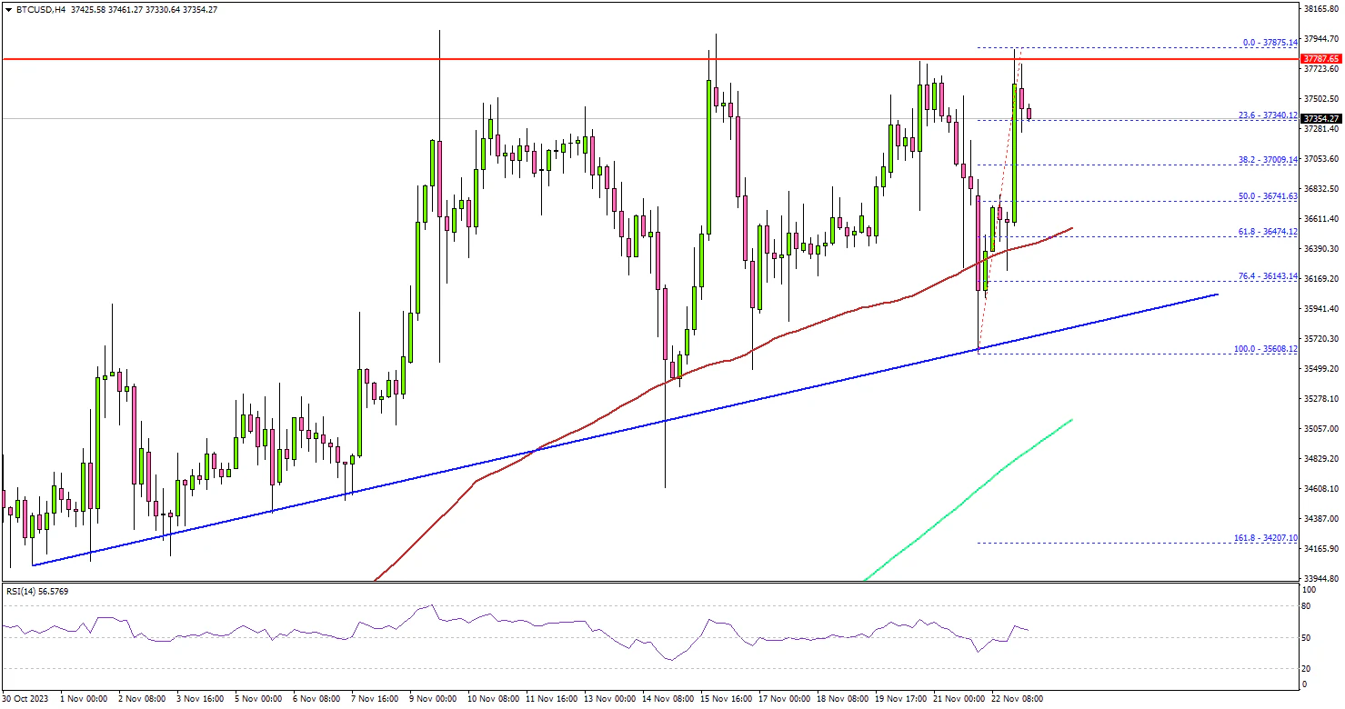If there is a fresh increase, Bitcoin could face resistance near $37,600. The next resistance is near $38,000. A successful close above the $38,000 level might start a decent increase. In the stated case, the price may perhaps rise toward the $40,000 level.