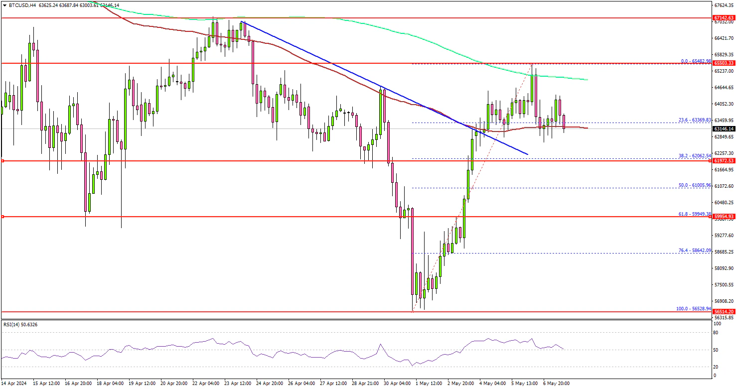 A high was formed at $65,482 and the price corrected gains. It retested the 100 simple moving average (red, 4 hours). Immediate support is near the $62,000 level.