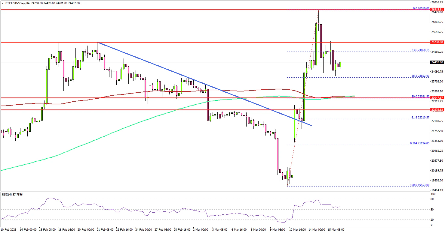 The price traded to a new monthly high at $26,510 and recently corrected gains. There was a move below the $25,000 support zone.