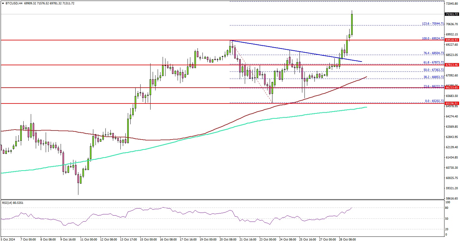 The next key resistance is at $72,000. A successful close above $72,000 might start another steady increase. In the stated case, the price may perhaps rise toward the $73,000 level or even a new all-time high.