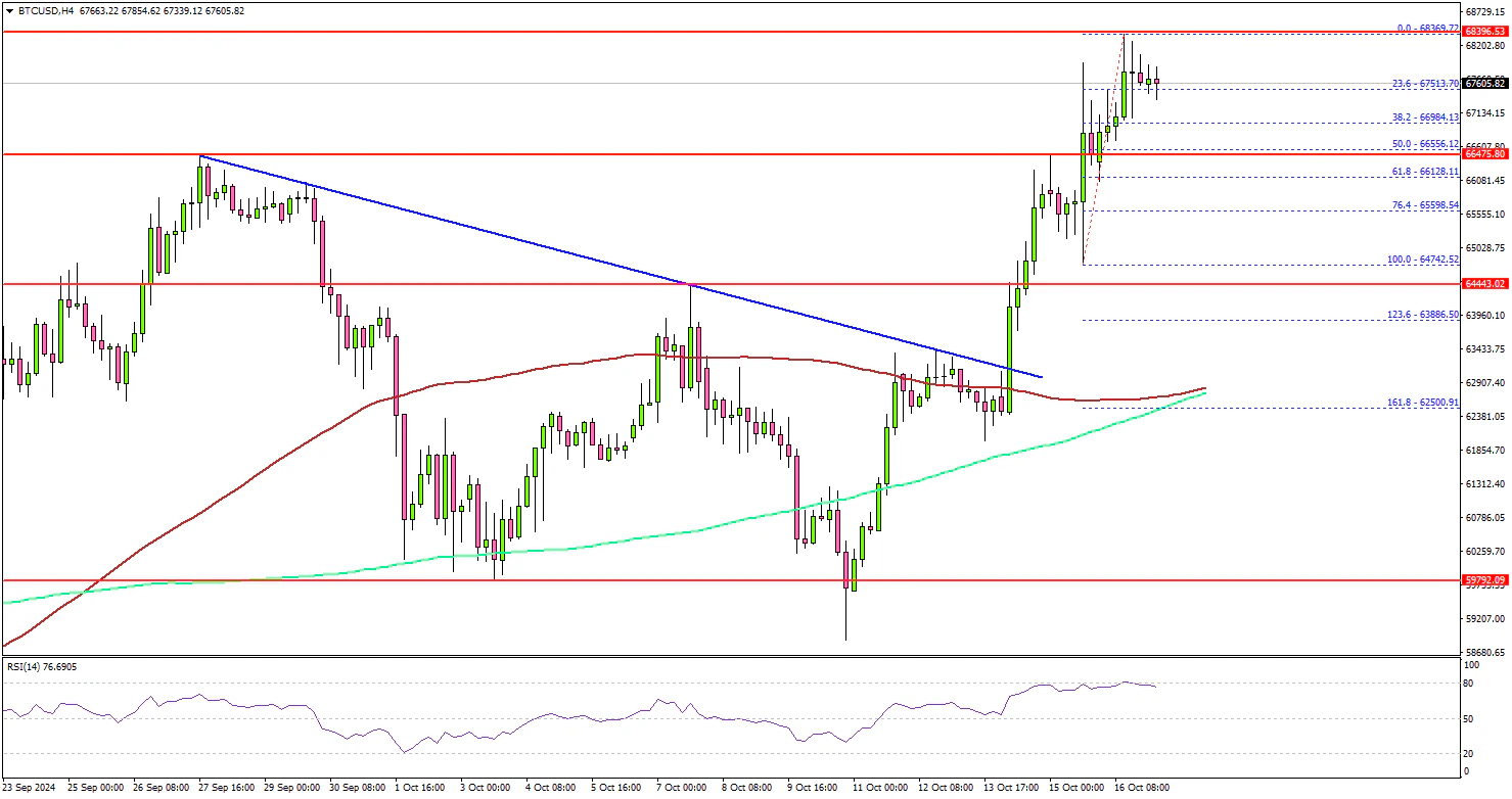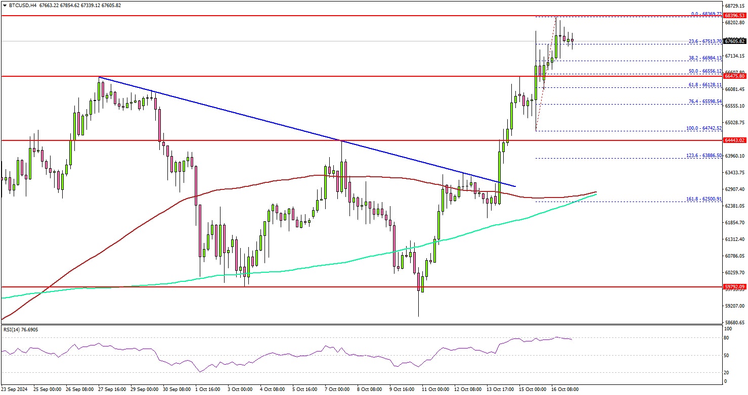 The increase was such that the price soared above the $67,500 level. It even spiked above $68,000 before the bears appeared. The price is now consolidating gains. Immediate support is near the $66,800 level.