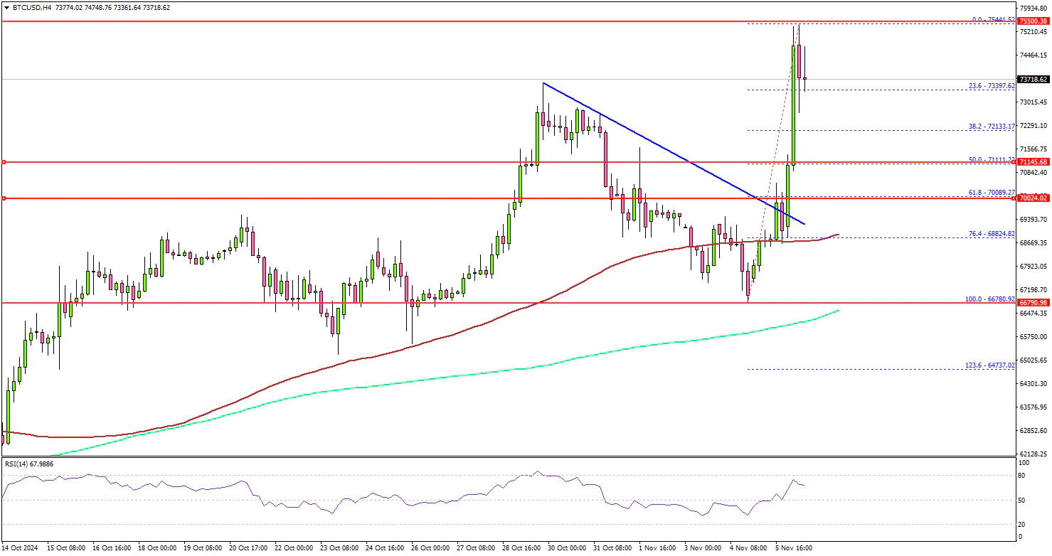 - Bitcoin price started a fresh increase and traded to a new all-time high above $75,000.