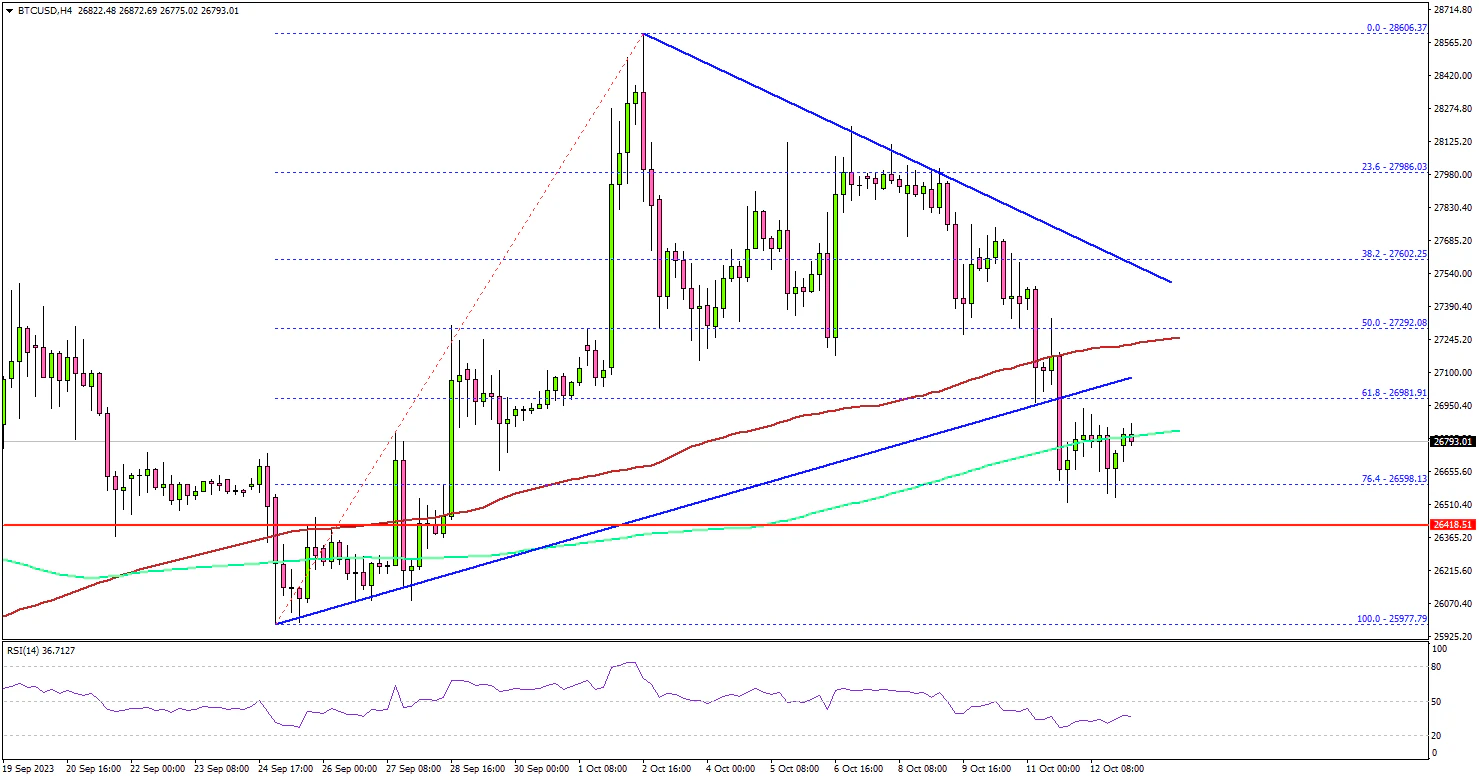 Looking at the 4-hour chart, the price there was a sharp bearish move below the $27,500 level. The price traded below a major contracting triangle with support at $27,000.
