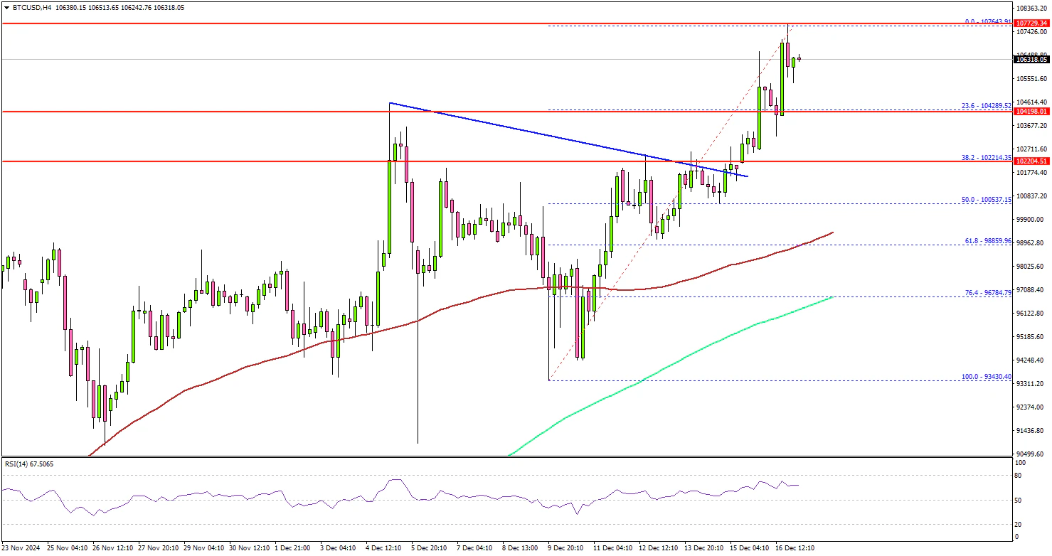 - Bitcoin price started a fresh rally and traded to a new all-time high at $107,643.