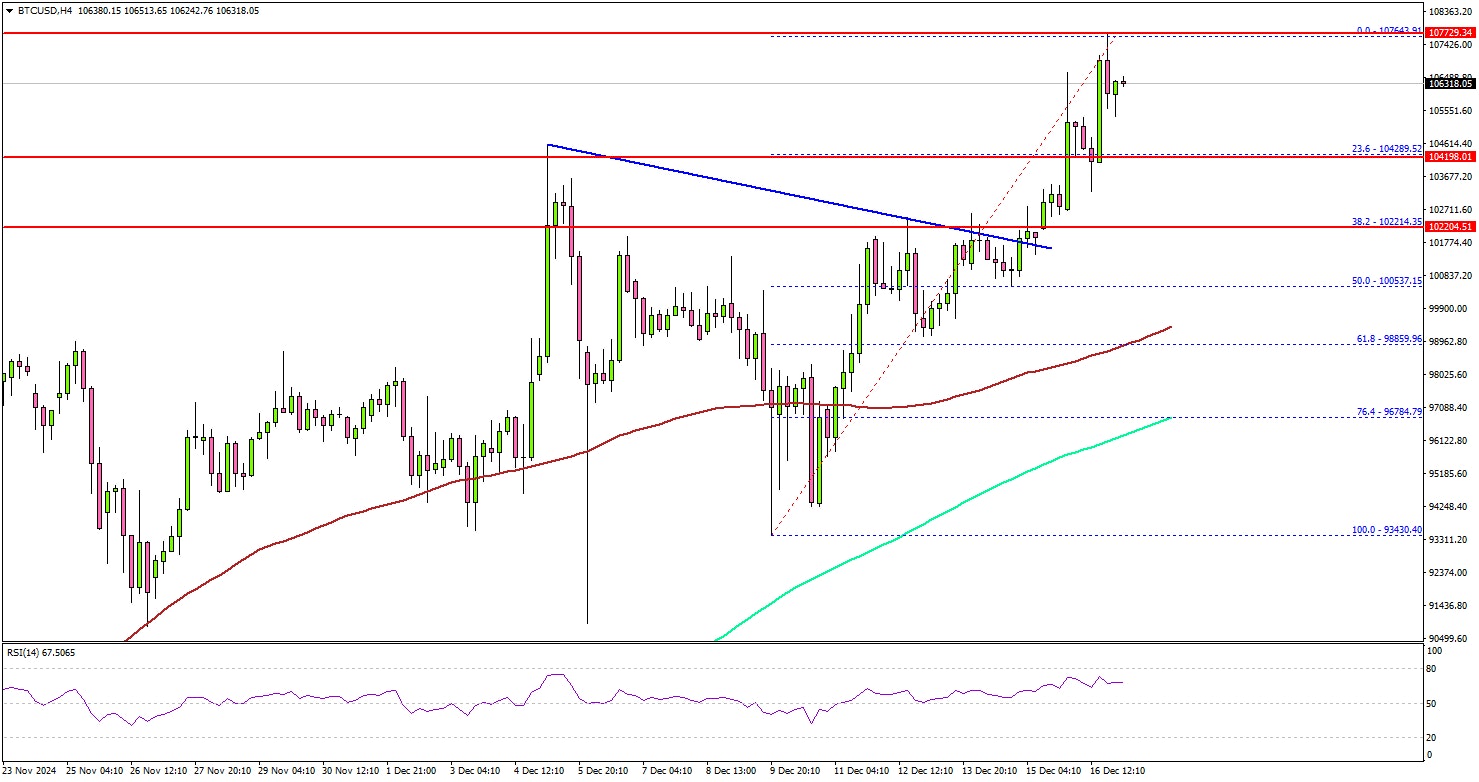 • Bitcoin price started a fresh rally and traded to a new all-time high at $107,643.