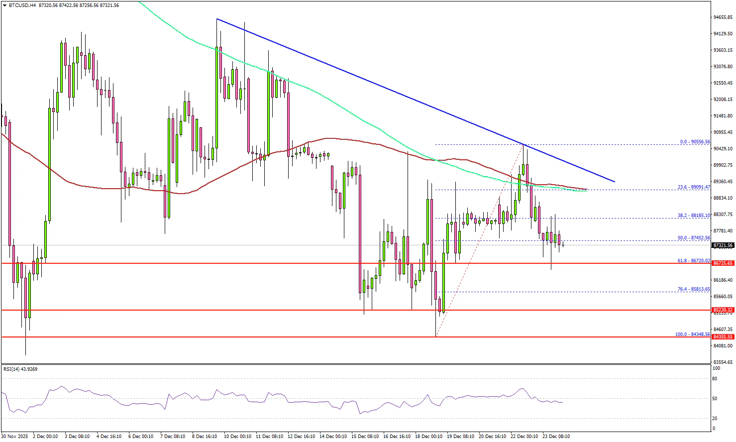 Immediate support sits at $86,800. A downside break below $86,800 might start another decline. The next major support is $85,200. Any more losses might call for an extended decline toward the $83,500 support zone.
